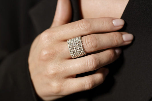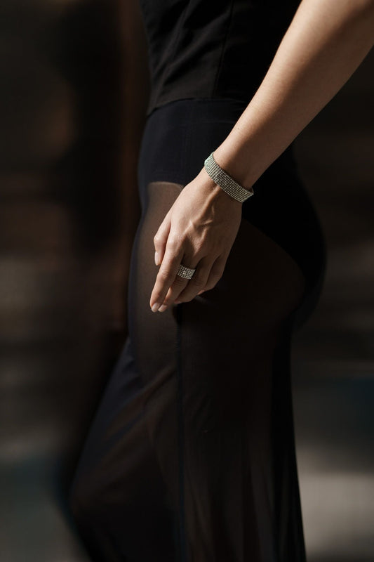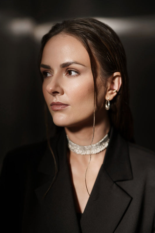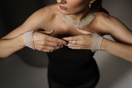 With the heightened existential risks facing our country, modern Ukrainian women have revived the tradition of wearing beaded jewelry, skillfully combining it with everyday, office, or festive attire. Inspired by this revival and filtering these creations through my own vision, I wanted to weave them using tiny silver beads instead of traditional seed beads.
