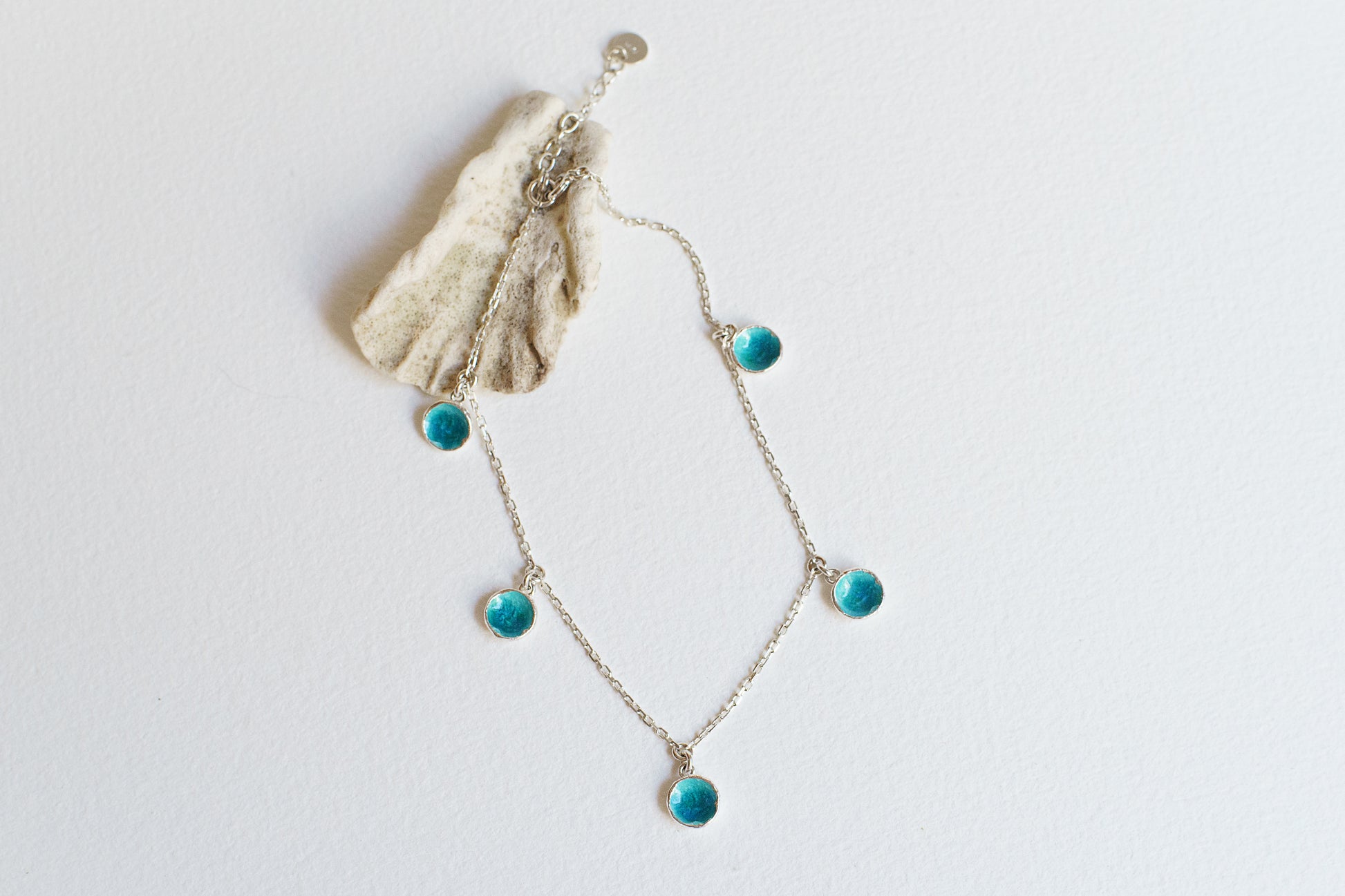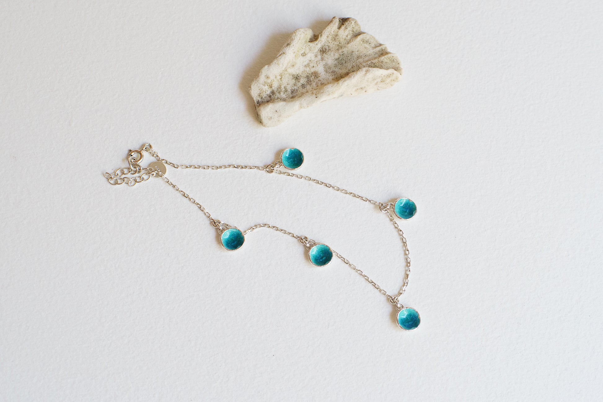 The "Seas" anklet is a must-have accessory for any beach lover. Available in both a stunning blue and vibrant emerald color, this anklet features a delicate enamel design inspired by the beauty of the sea. Upgrade your summer style with this elegant anklet that will surely make a splash wherever you go.