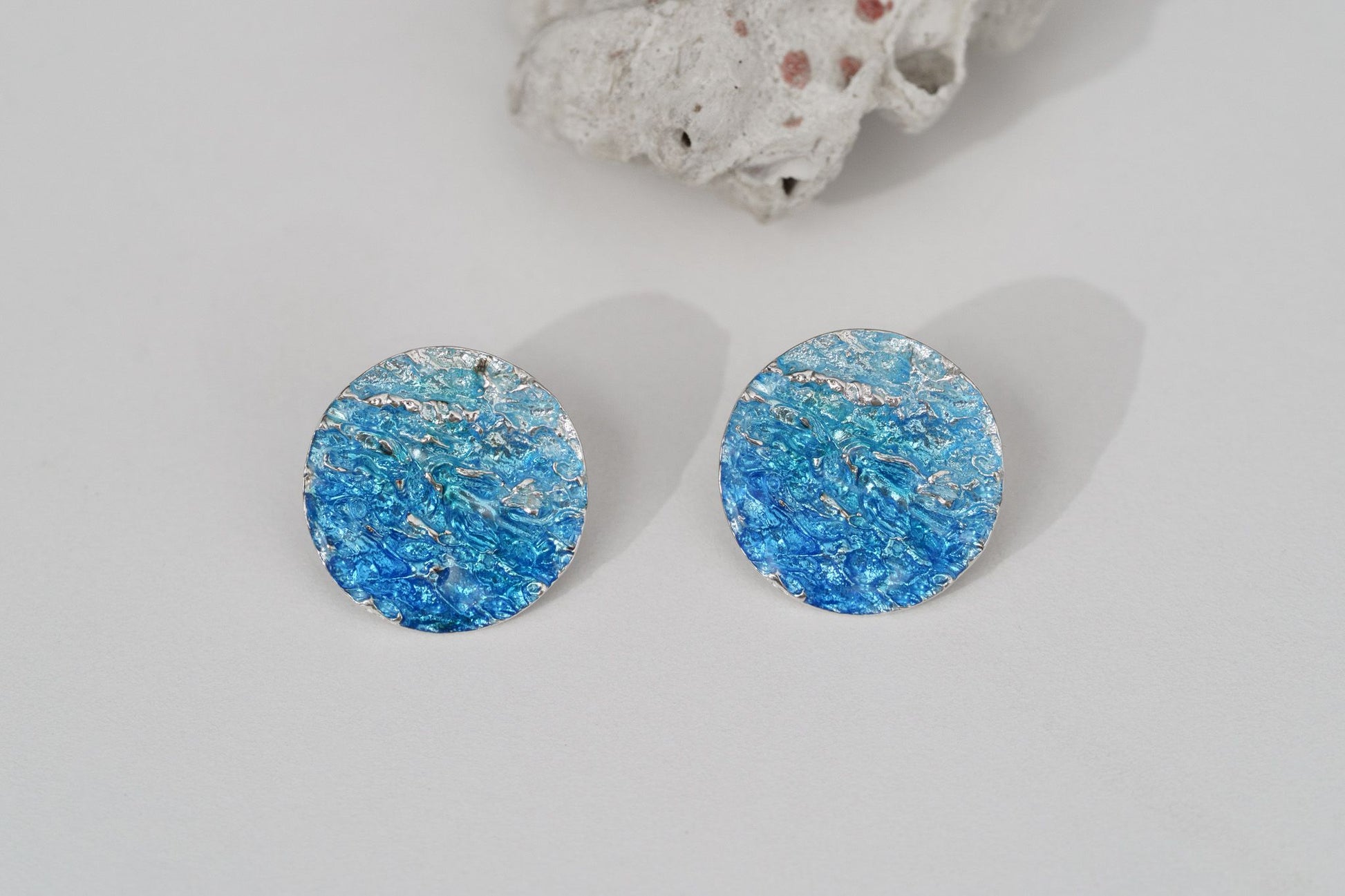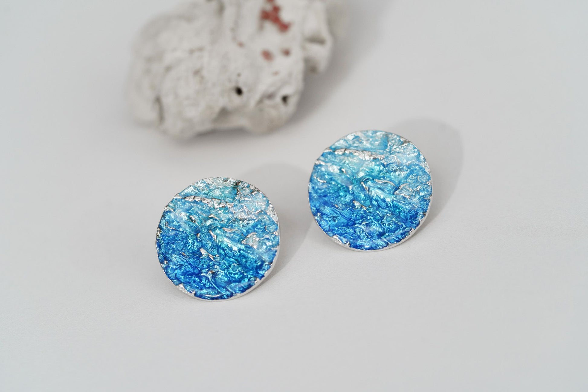 Discover the breathtaking beauty of these "Wave" blue disc earrings. Handcrafted to perfection, each exquisite earring features a stunning emerald gemstone that captures and reflects light from every angle. Experience the amazing allure and elegance of these earrings for yourself.