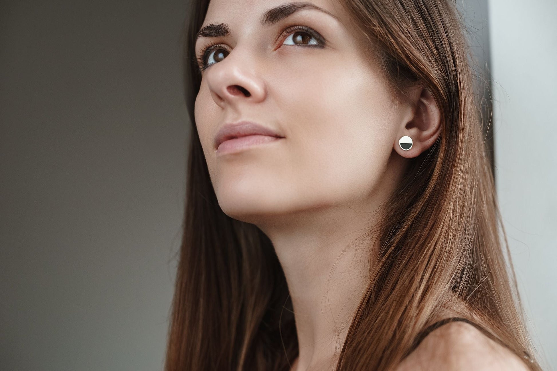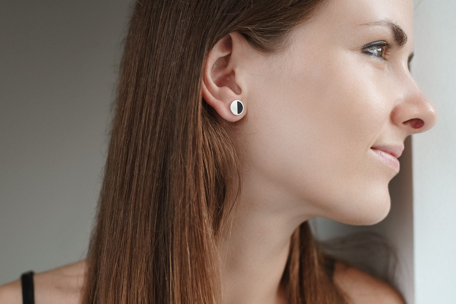 Earrings "Half Full" Circle with Black Enamel — stylish jewelry that symbolizes balance and optimism in every situation. The minimalist design with a black enamel accent adds a modern look and versatility. They will be a refined highlight in your look, emphasizing your individuality and bold sense of style.