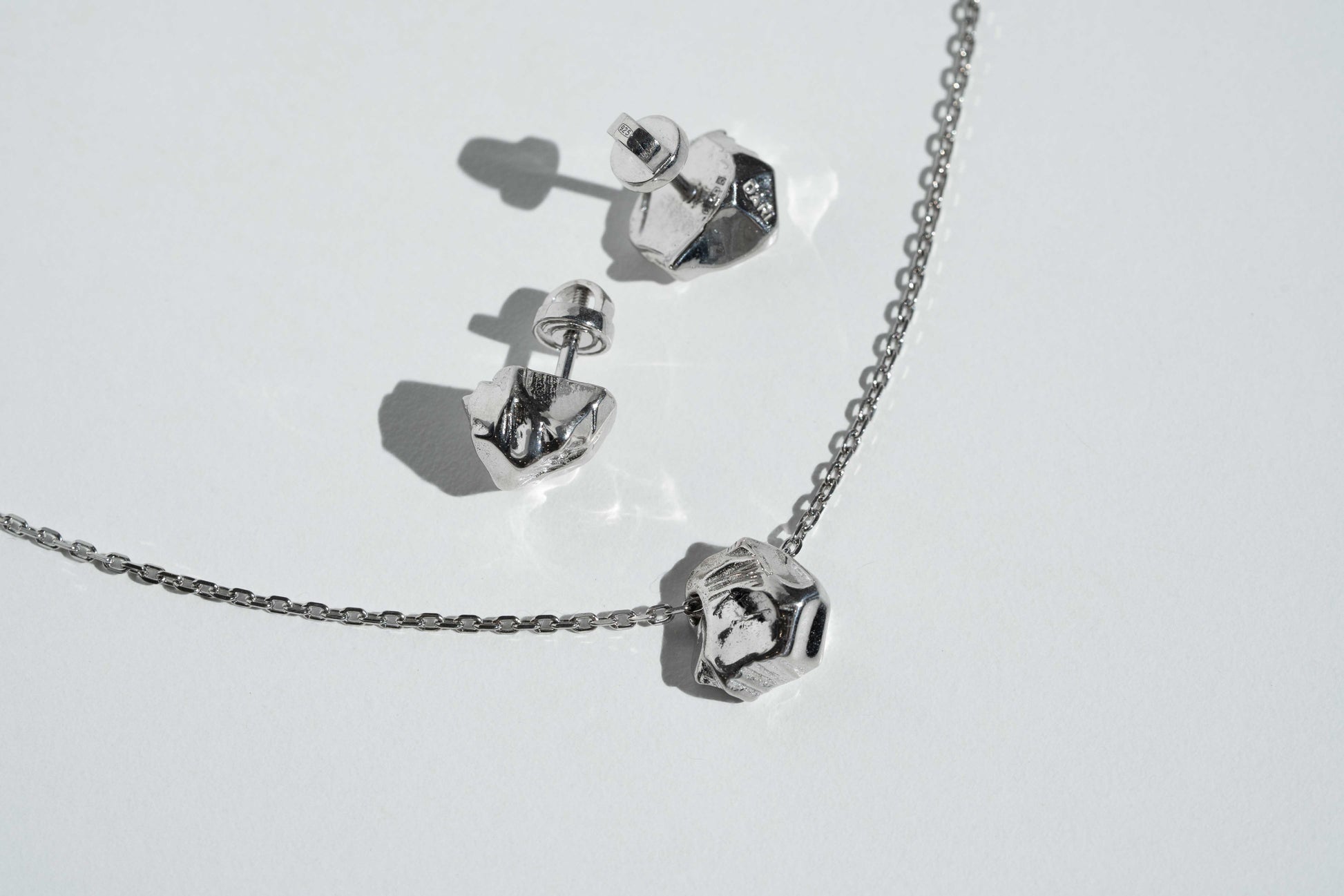The “Stone” earrings in a light finish is about inner balance and quiet strength.