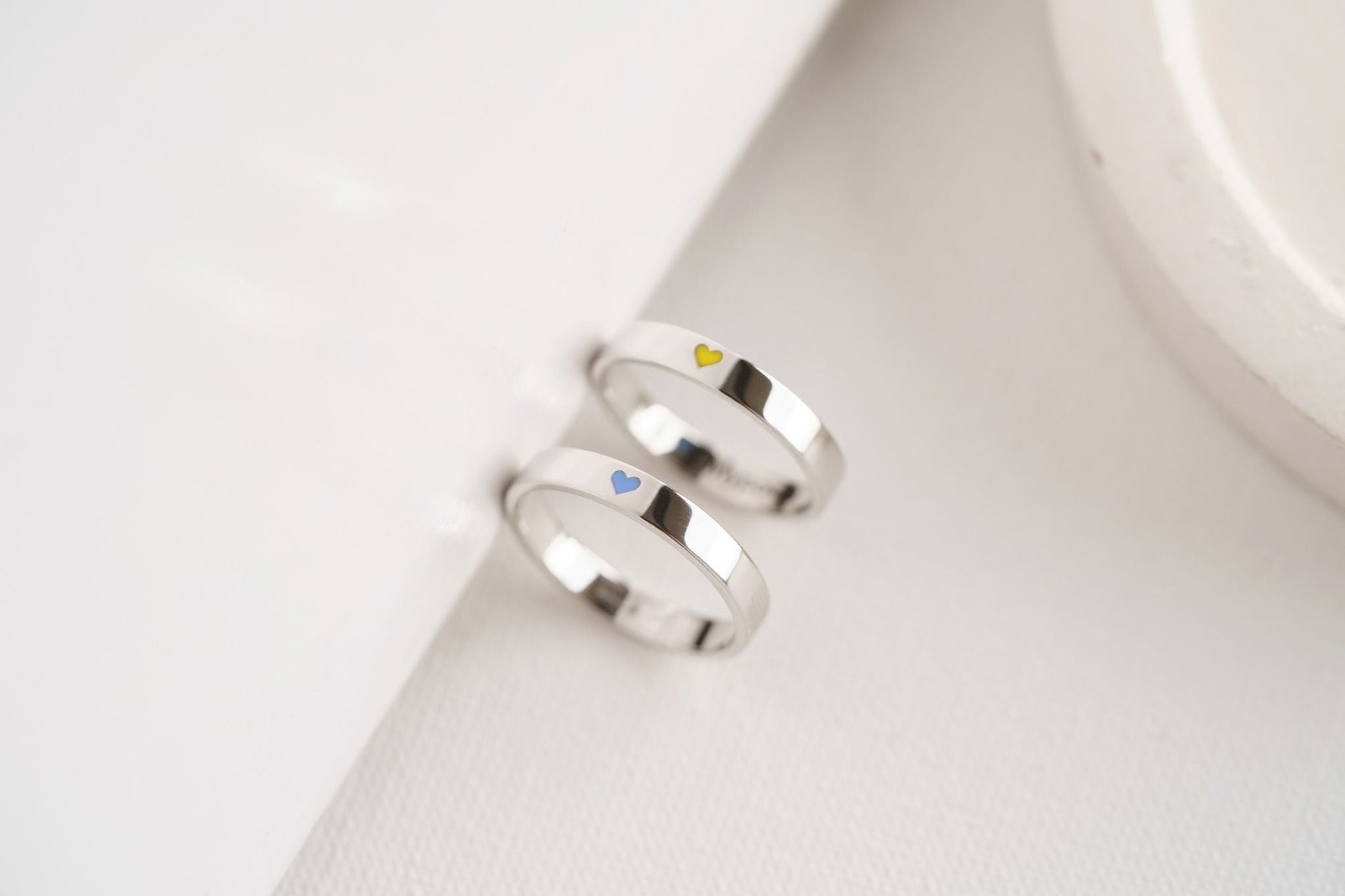 A pair of wedding rings "Beloved Country" (3 mm) with one heart is the embodiment of love and patriotism. The use of blue and yellow colors of the heart is reminiscent of the national flag of Ukraine and reflects a deep sense of connection with the native land. The hearts embodied in the colors on these wedding rings symbolize the unity and devotion that permeate the couple's relationship, and are also an expression of support and respect for their country.