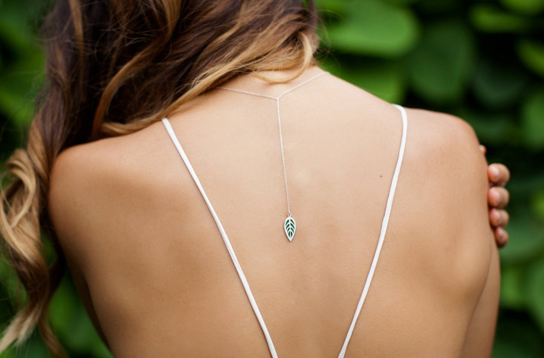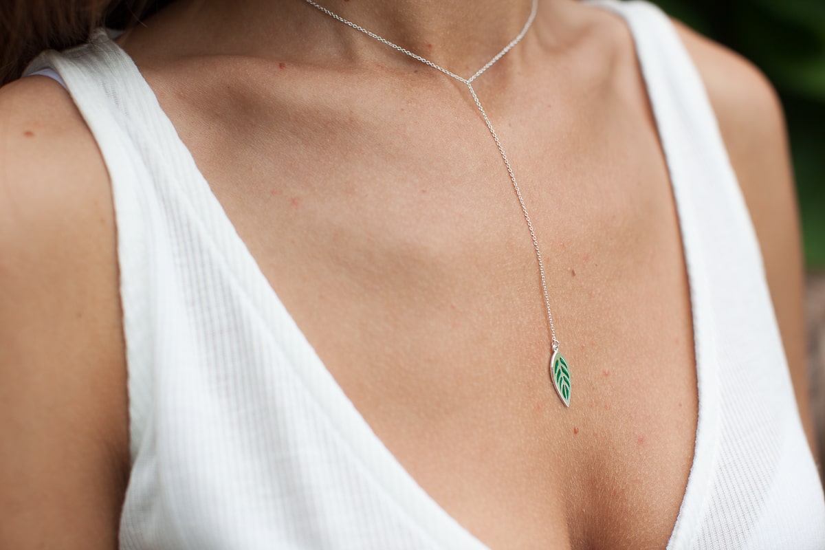 The "Indian Leaf" necklace with green enamel is a delicate piece inspired by ethnic motifs, embodying the harmony of nature. The vibrant green enamel leaf adds a touch of color, while the long, refined lariat-style chain creates a light and elegant silhouette. A perfect choice for stylish looks with a hint of natural aesthetics.