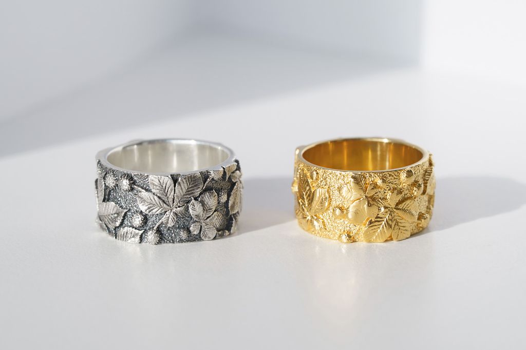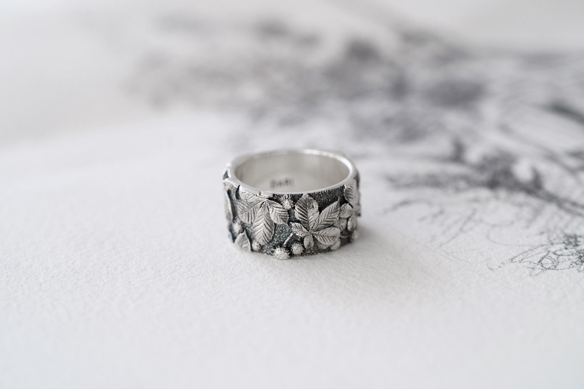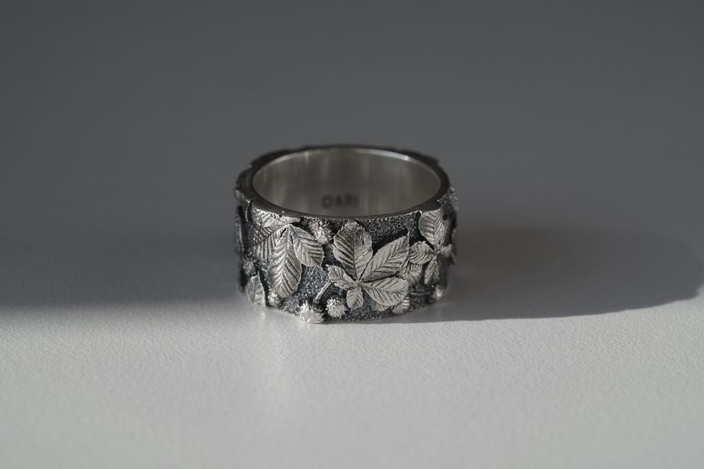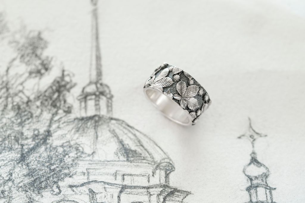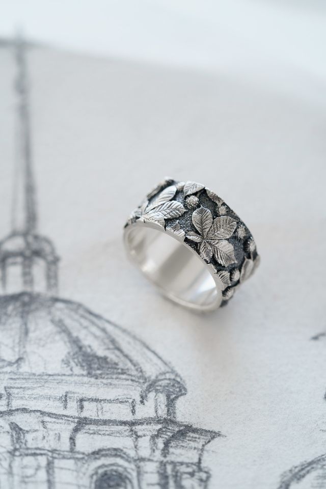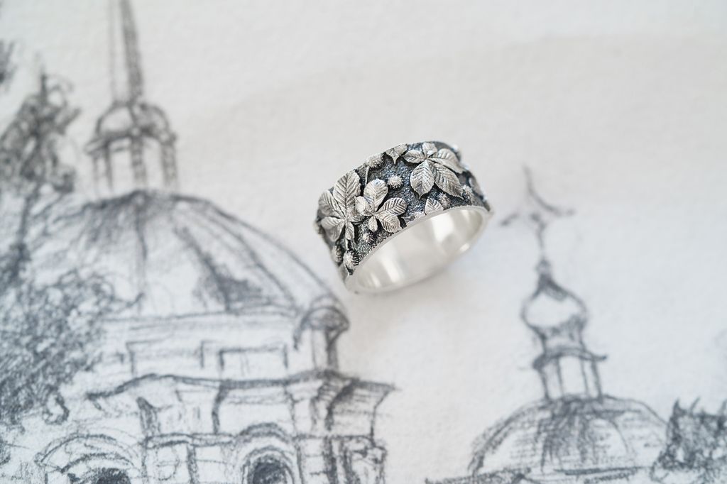 Blackened ring with chestnut leaf relief — a portrait of Kyiv, filled with strength, the quiet of old streets, and the rustle of trees that remember everything.