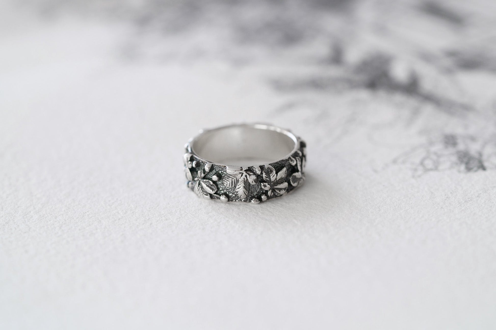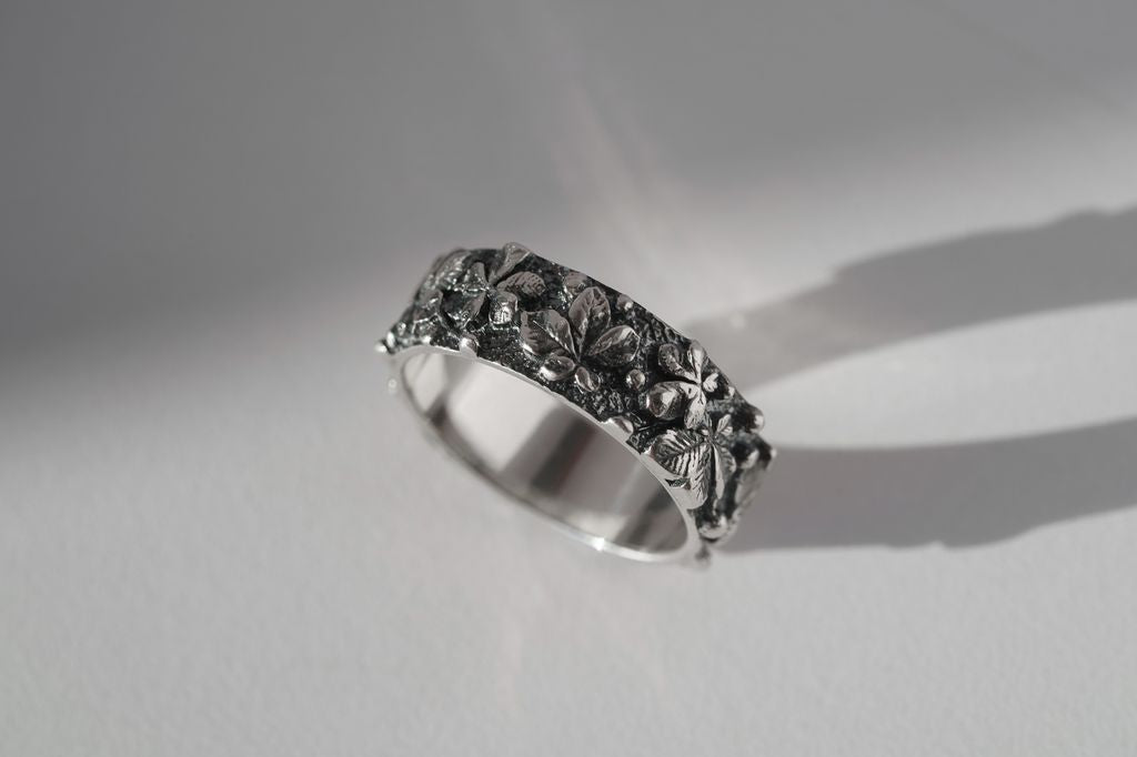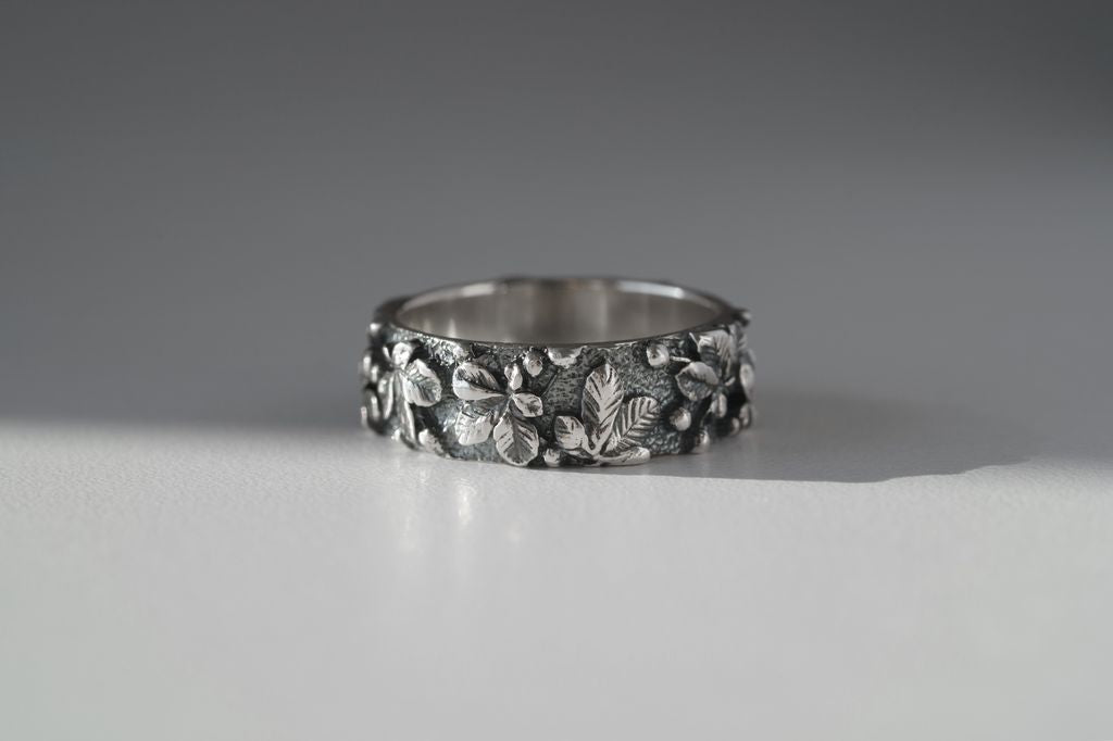 Dark ring with chestnut leaf relief — a tribute to Kyiv, its streets, and the memories scented with spring.