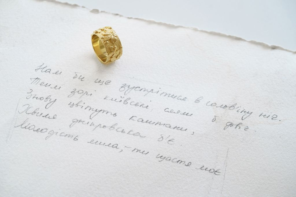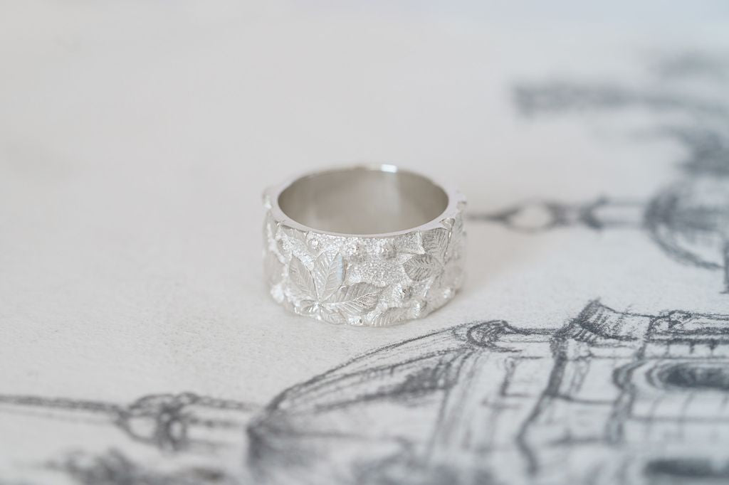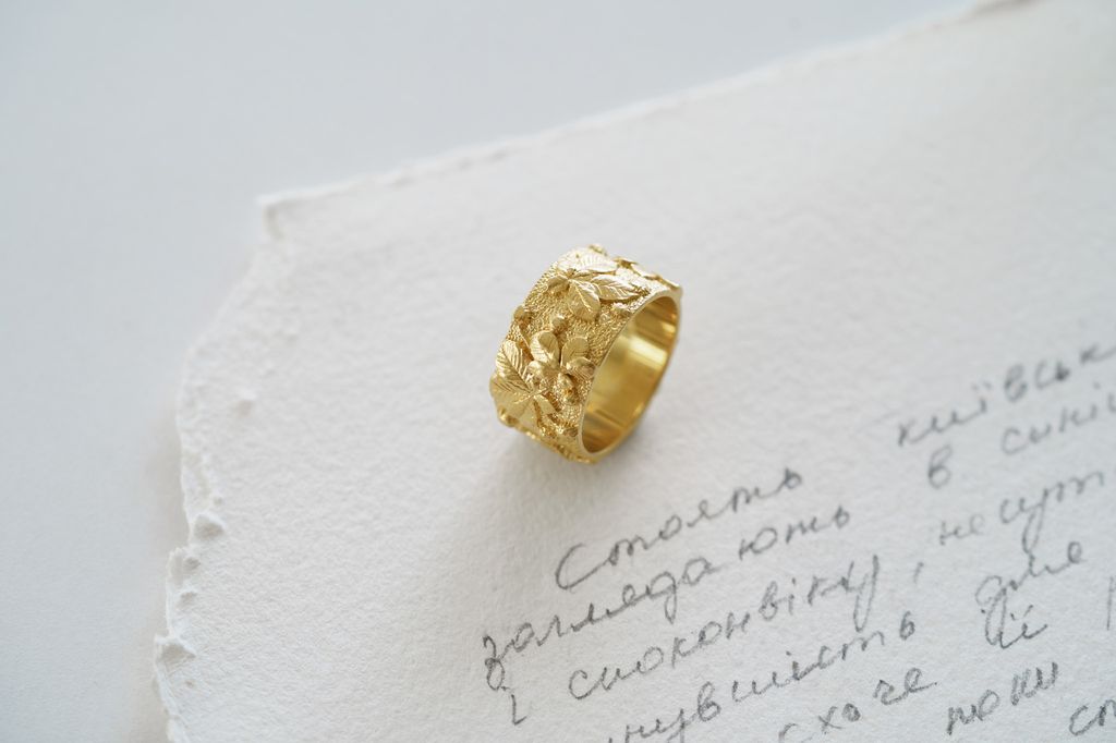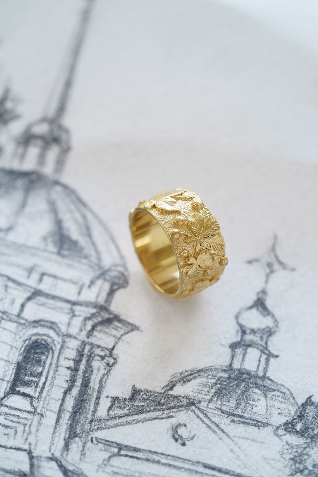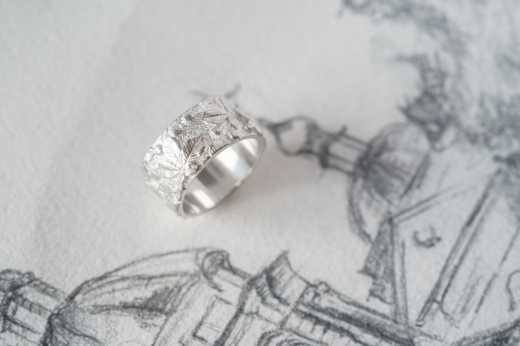 Light ring with chestnut leaf relief — an embodiment of Kyiv, filled with strength, the calm of old streets, and the rustling of trees that remember everything.