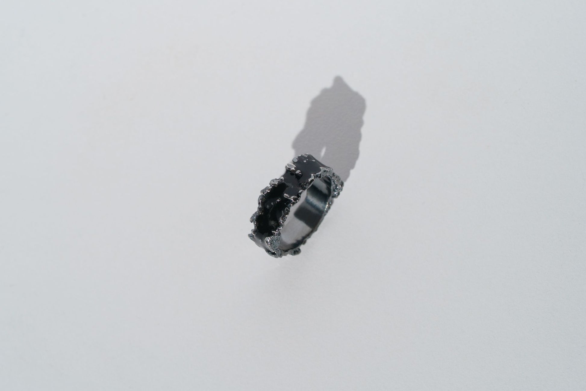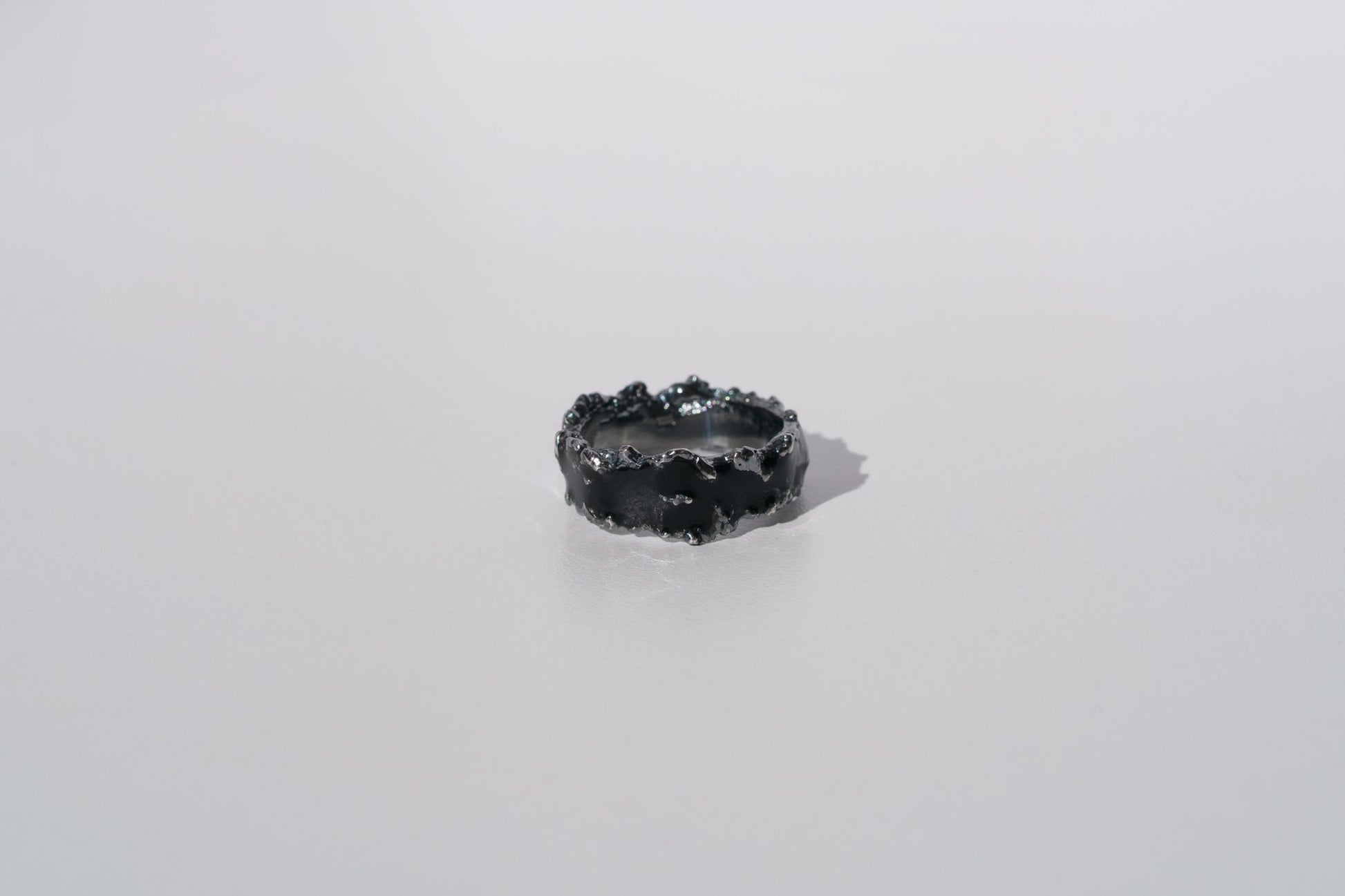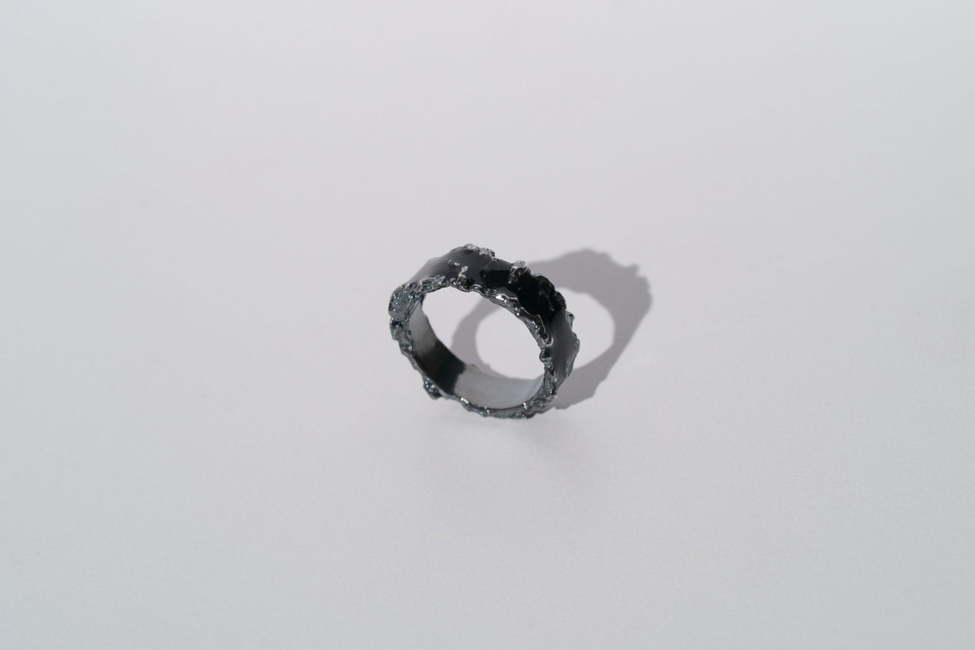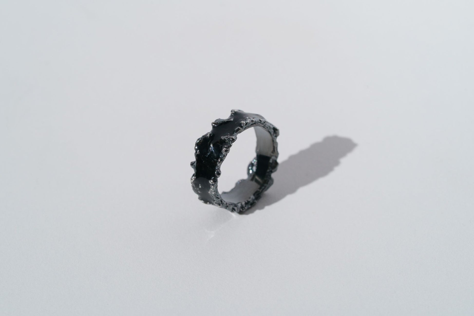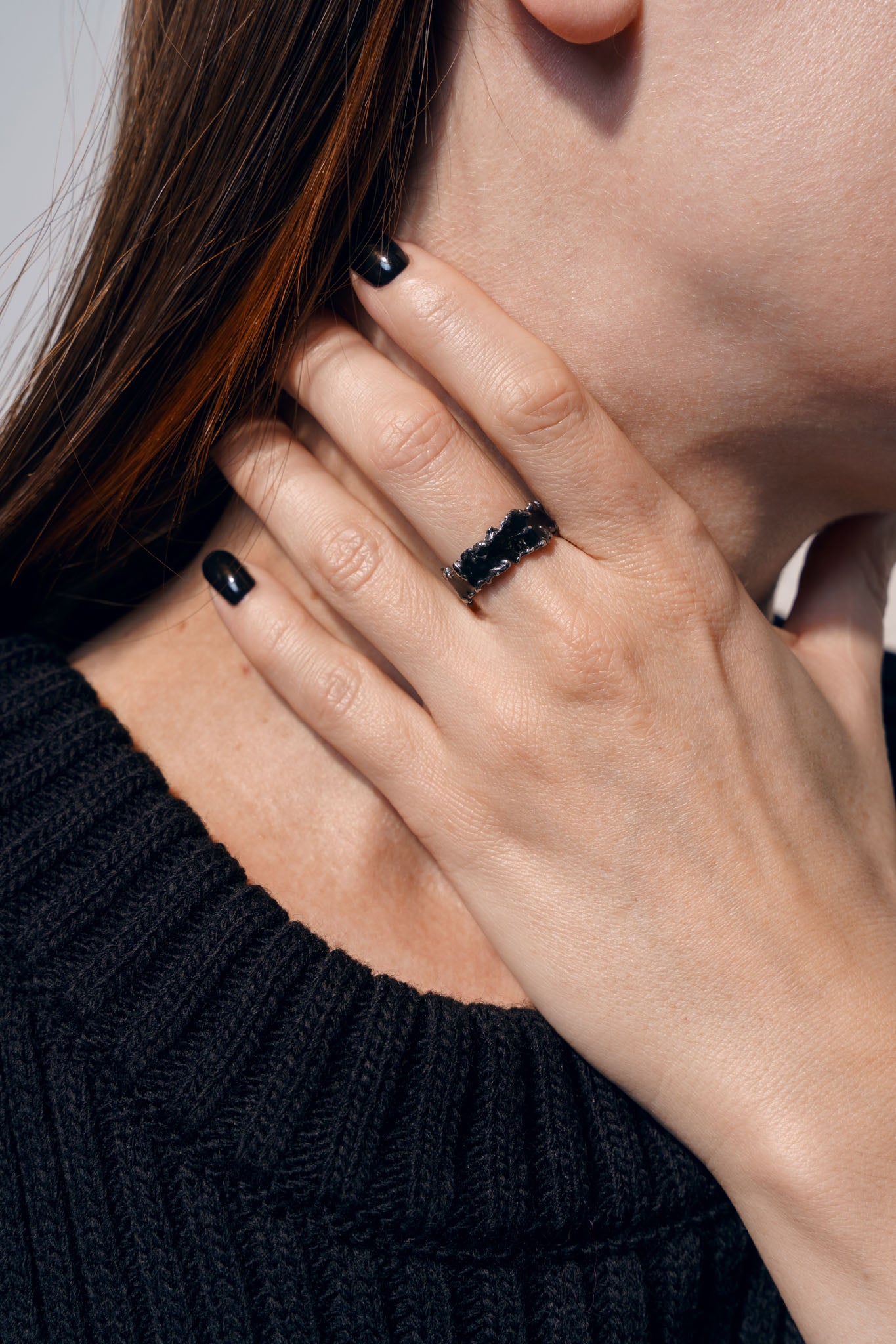 This 6 mm "Dark matter" ring irradiates sophistication and mystery. Its elegant design and striking appearance make it a standout piece. With its enigmatic allure, this ring is sure to make an impression.