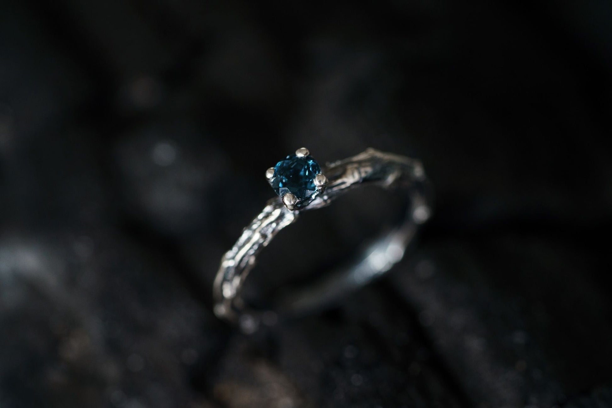 Set with a 3.5 mm London Blue Topaz — a deep, oceanic gemstone — this ring glows with moody sophistication.