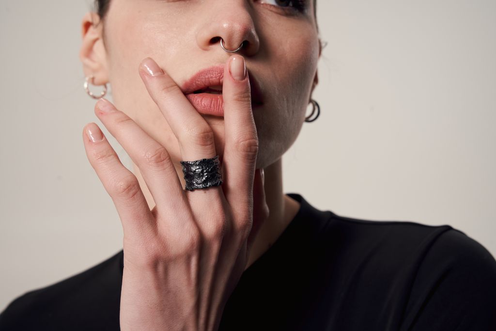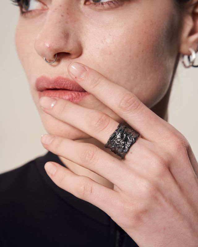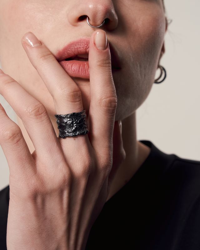 The "Reefs" ring (15 mm) boasts of a bright and dark blackened finish. Crafted in larger 15 mm size, this ring adds a bold accent to any outfit. Made of lasting materials, this ring ensures durability for everyday wear. Elevate your style with the "Reefs" ring.