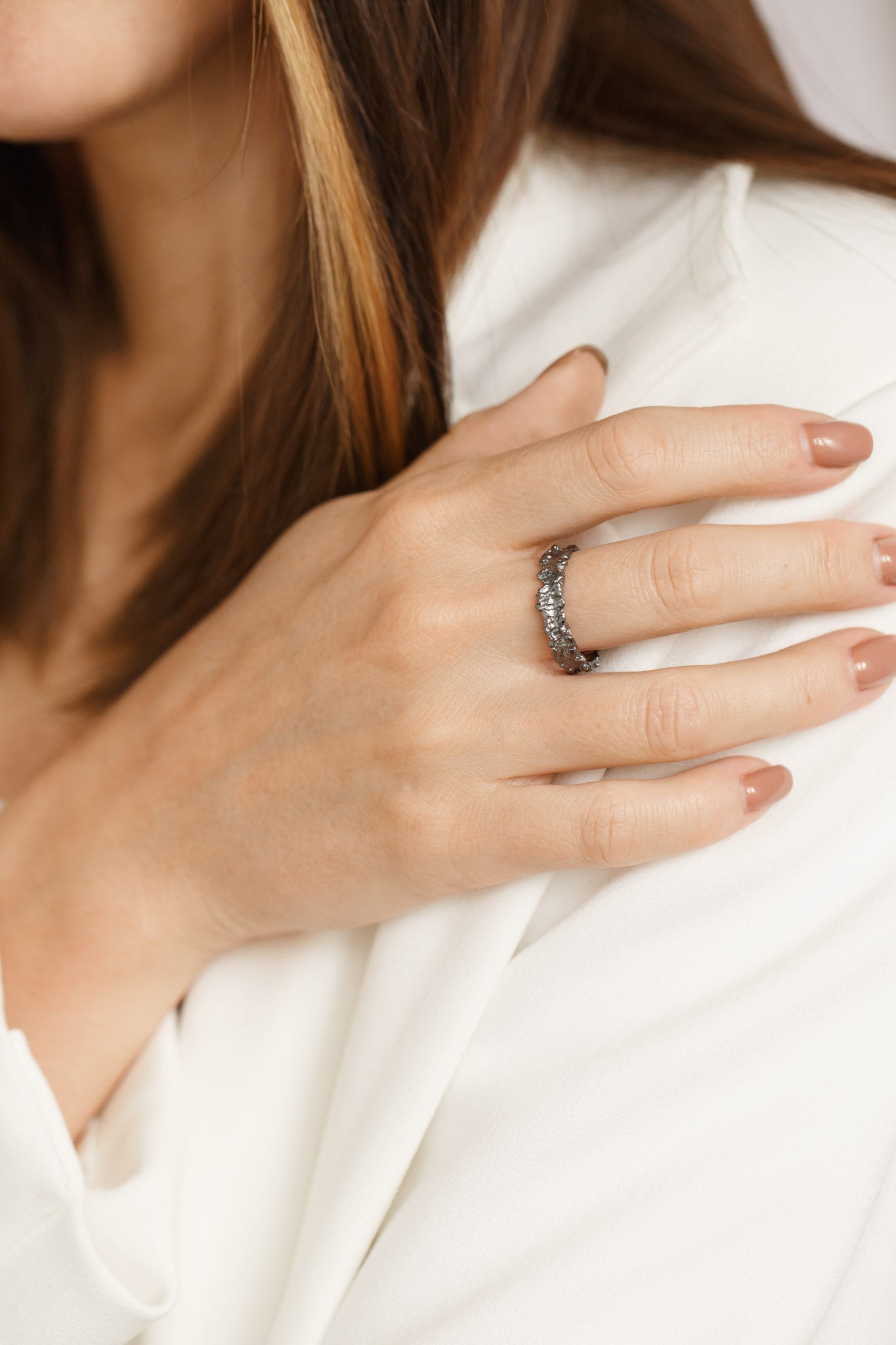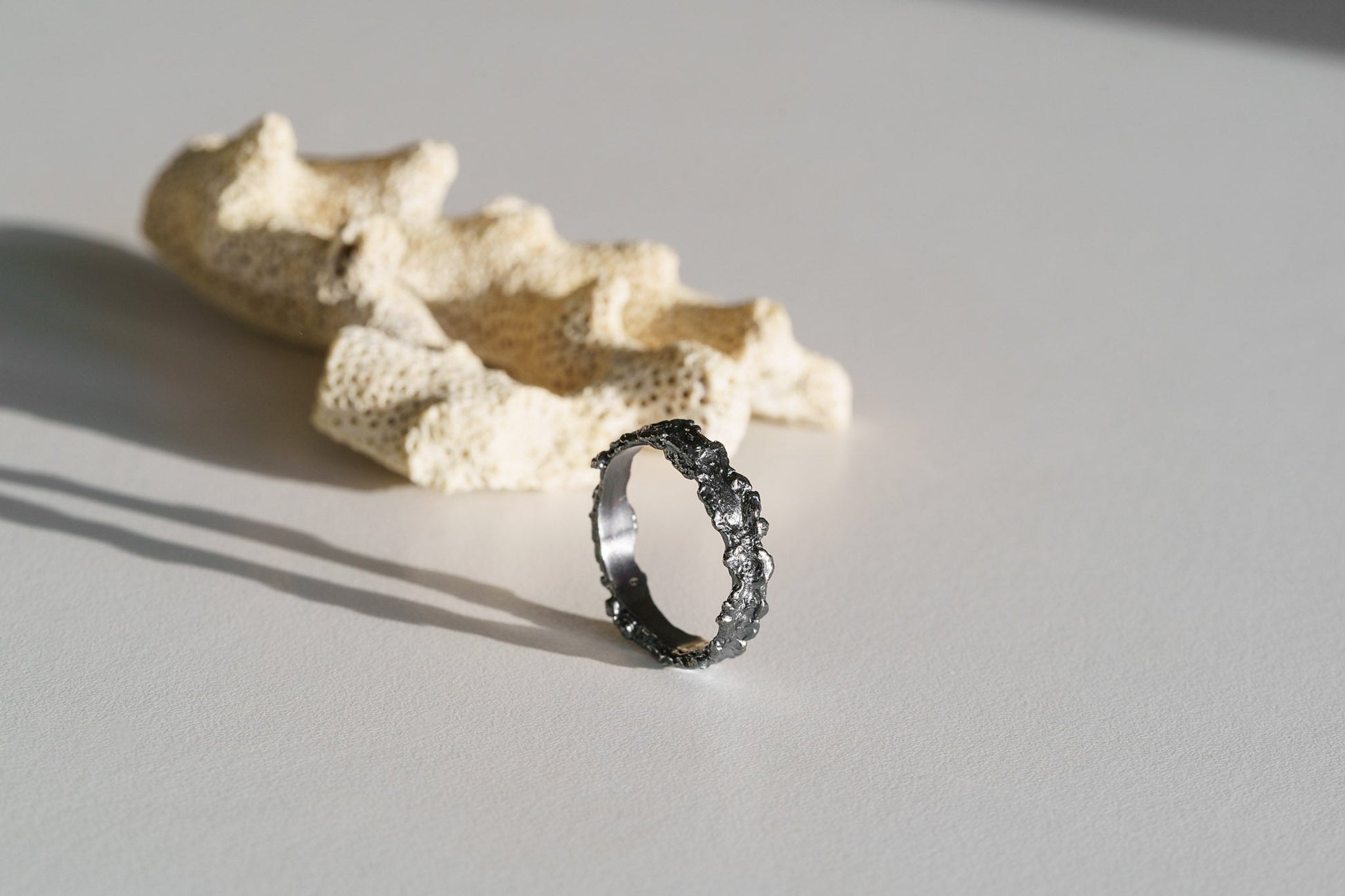 Expertly crafted with a delicate blackened finish and 4 mm width, the "Reefs" ring is a must-have accessory for any fashion-forward individual. Made of high quality materials, this ring exudes sophistication and adds a touch of edge to any outfit.