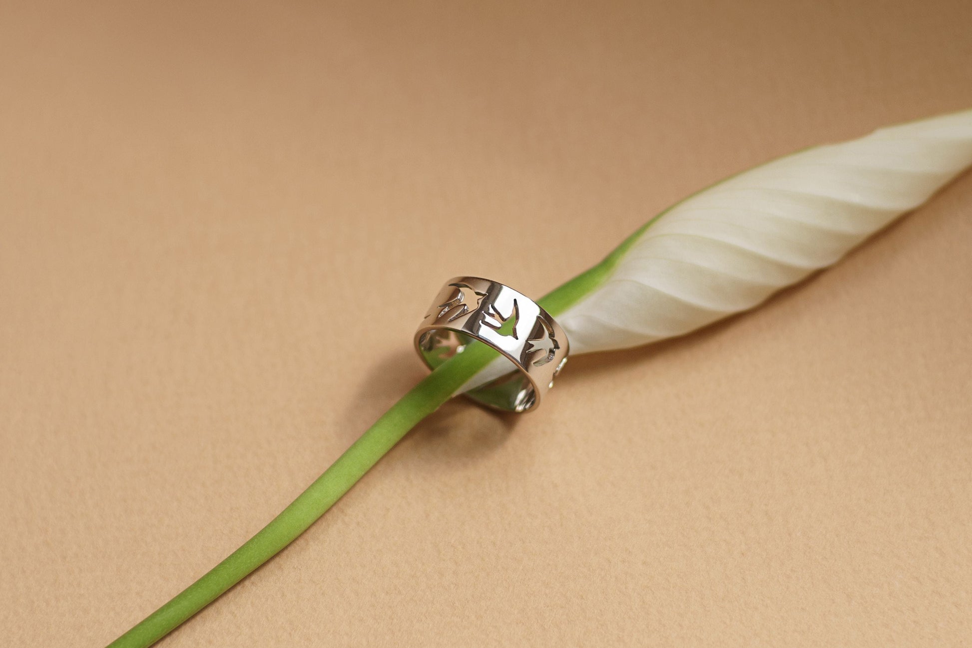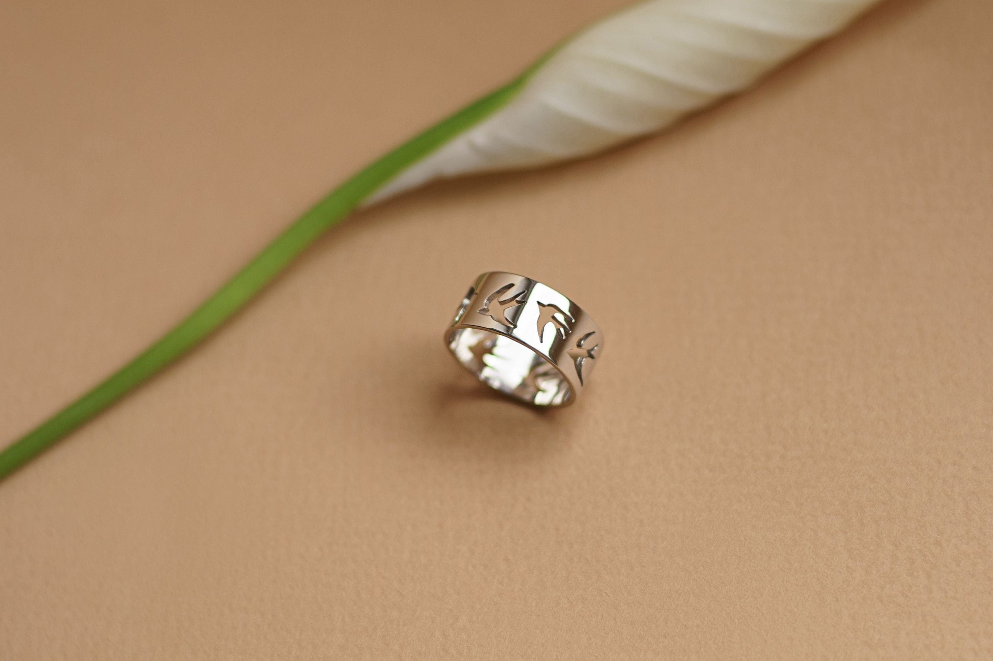 Ring "Swallows" (9 mm) — a stylish piece featuring a delicate swallow pattern. The glossy finish enhances its modern appeal and expressiveness, symbolizing freedom and lightness. An ideal choice for those who appreciate minimalist design with deep meaning.