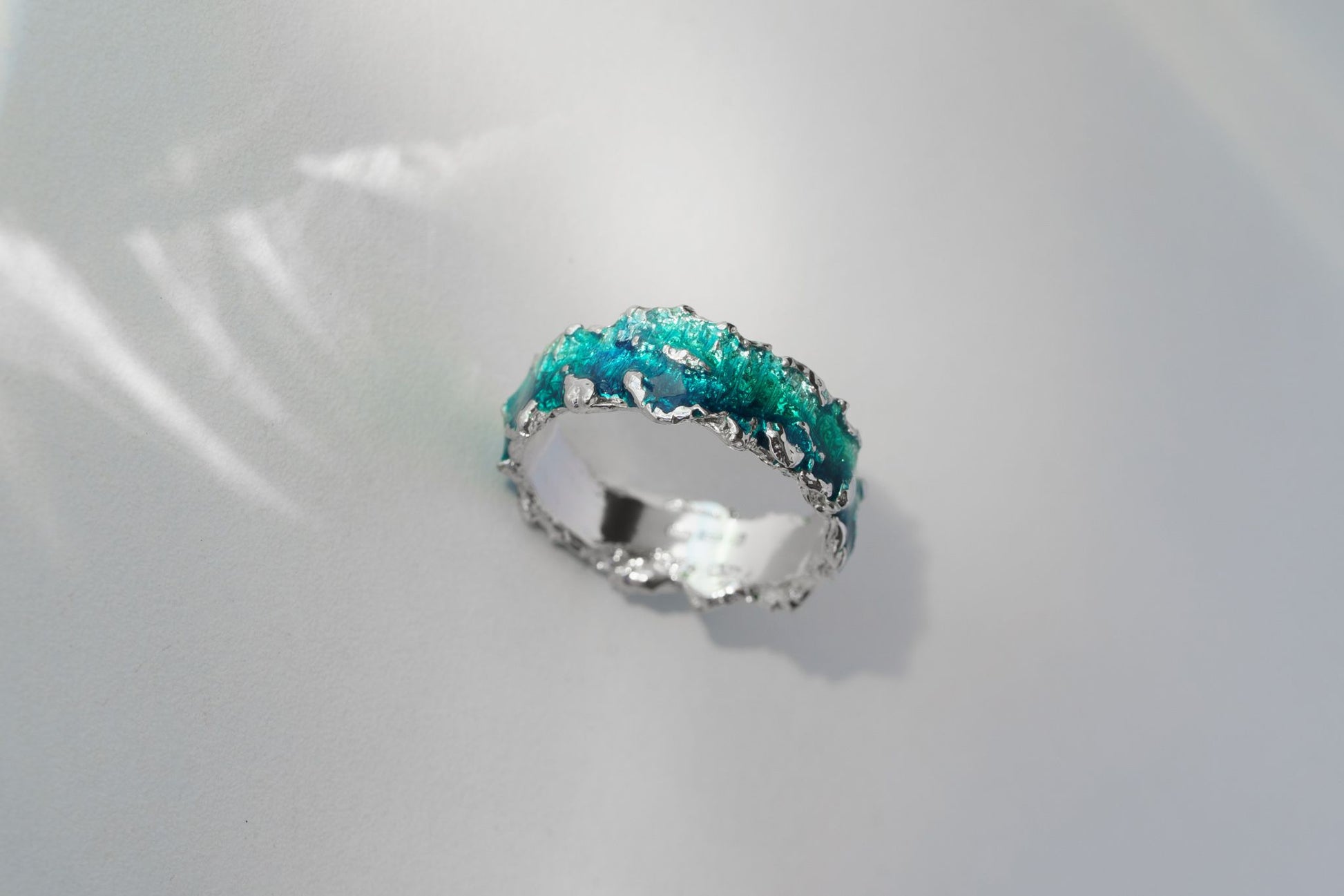 This "Wave" emerald ring features a 6 mm enamel band, demonstrating its one of a kind design. The enamel provides a strong and durable finish, making it a long-lasting piece. The vibrant green pattern of the emerald adds a touch of elegance and sophistication to any outfit.Present yourself with this unique and eye-catching ring.
