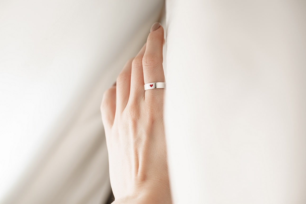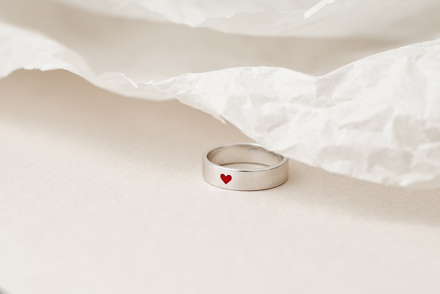 Ring "With Love" (5 mm; Red Heart) — a stylish piece with a sleek design that draws attention with its symbolic red heart. The ring's width adds expressiveness while maintaining elegance and a modern look. An ideal choice for those who appreciate minimalism with deep meaning.