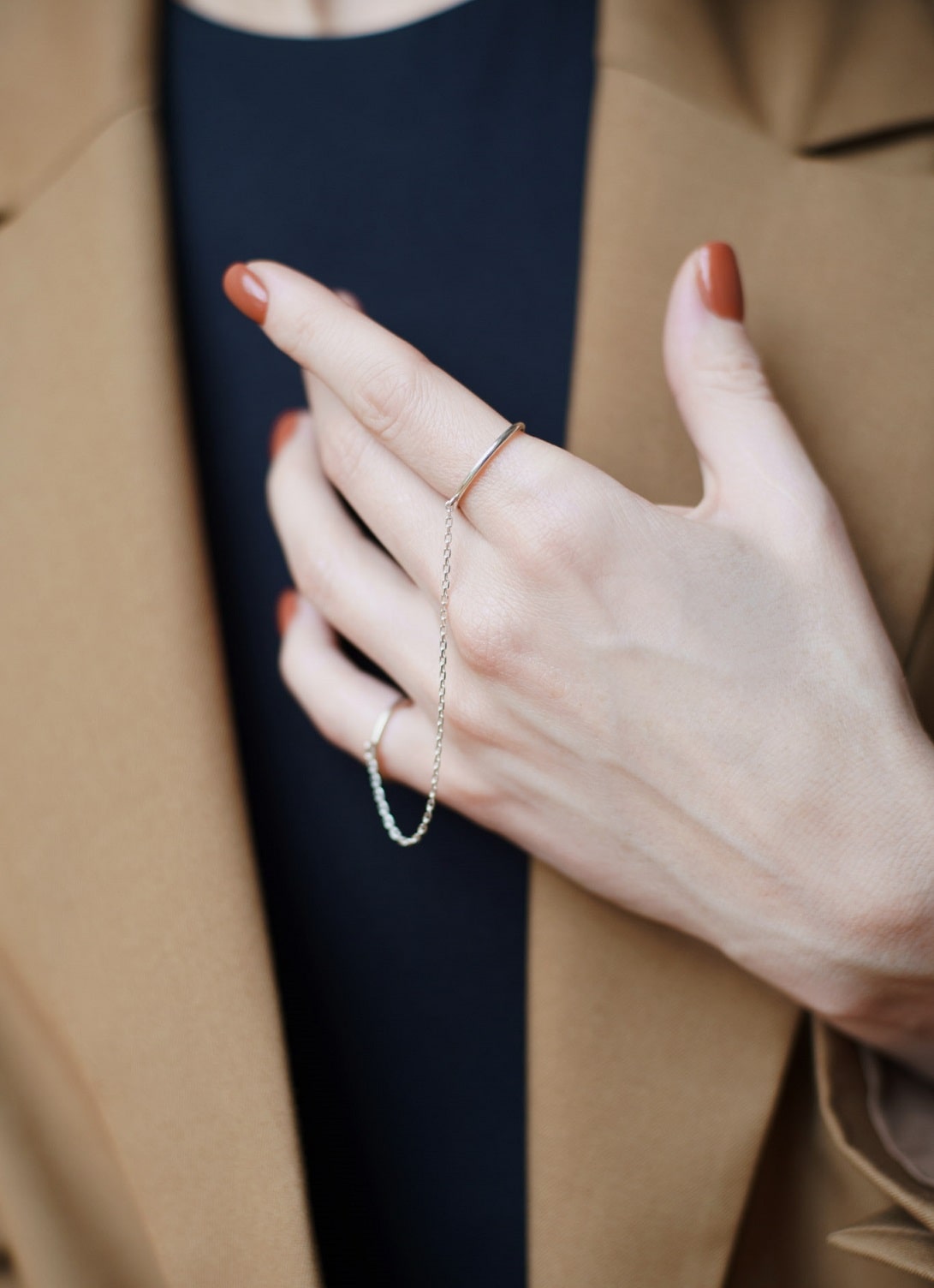 These "Connection" rings feature a unique and spectacular design that is truly undeniable. With an elegant chain length of 8.5 cm, these rings will add a touch of sophistication to any outfit. Elevate your style with these statement pieces.