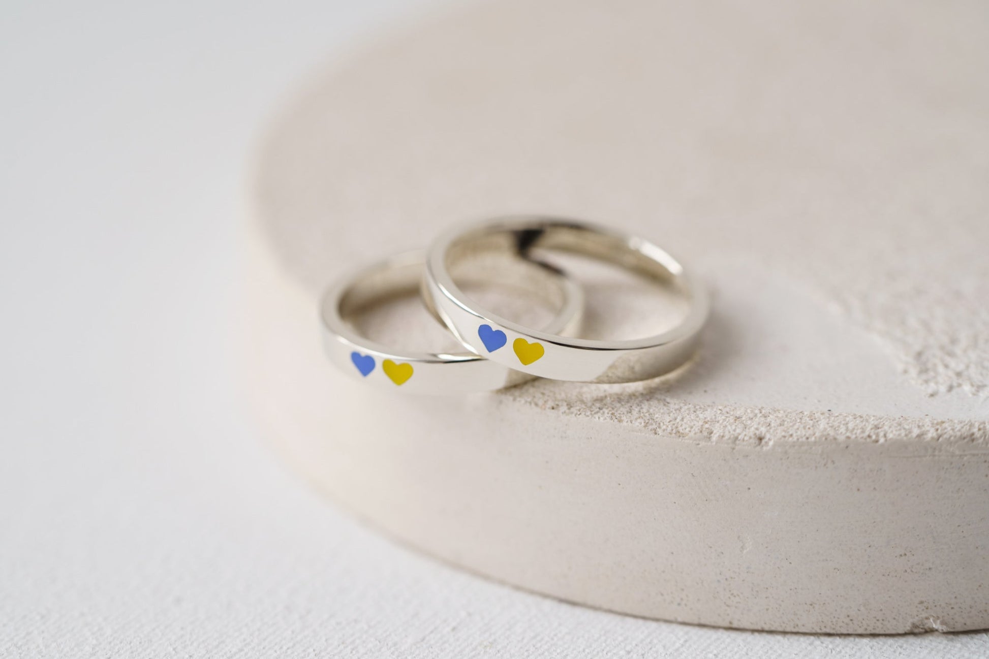 The "Beloved Country" (3 mm) wedding band pair with two hearts embodies love and patriotism. The use of blue and yellow in the hearts represents the national flag of Ukraine, reflecting a deep connection to the homeland. The two hearts on these rings symbolize unity and devotion within a couple’s relationship, as well as an expression of support and respect for their country.