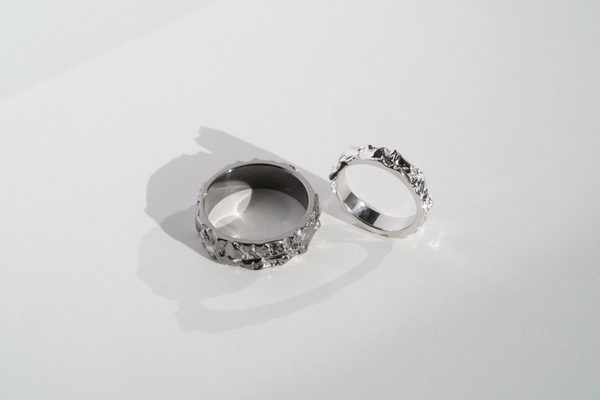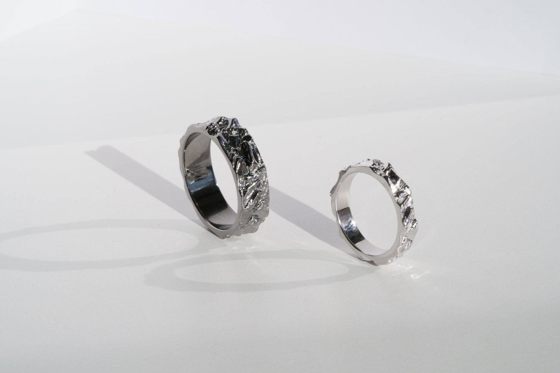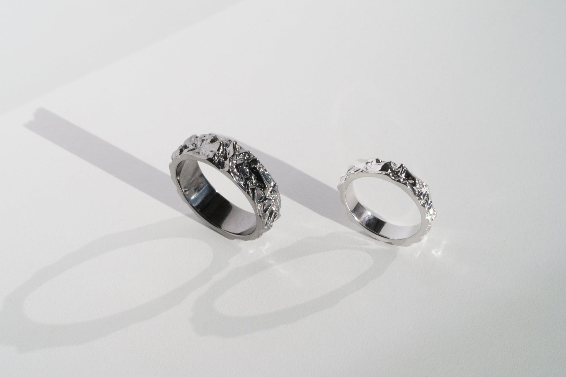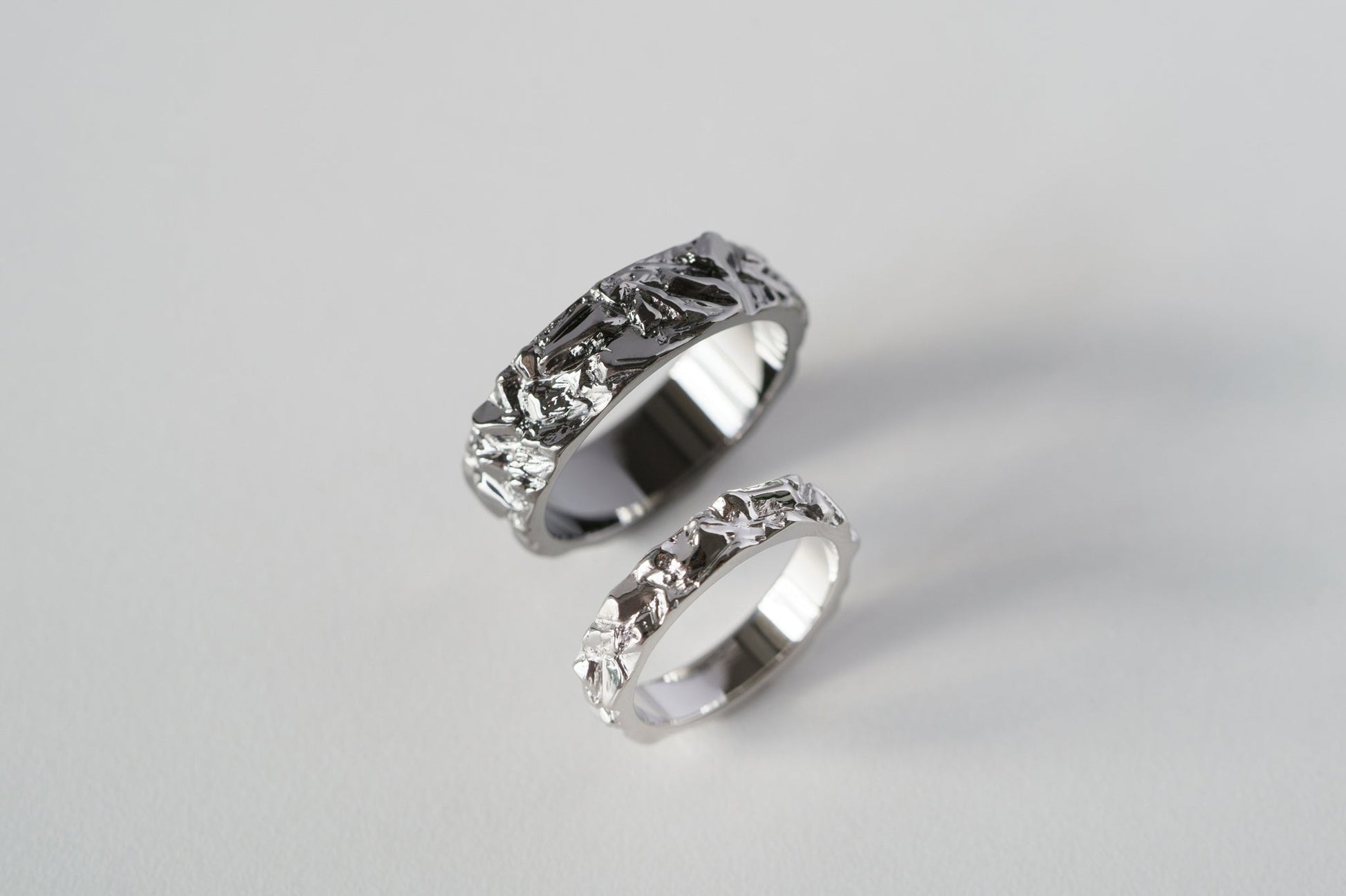 These wedding bands embody strength, stability, and the natural beauty of the wilderness. Inspired by the grand shapes and textures of granite cliffs, they symbolize the durability and eternity of your feelings.