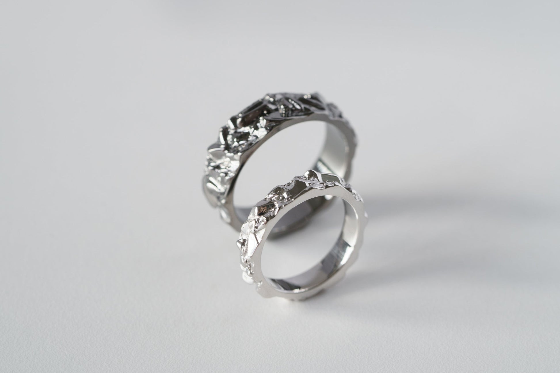 The design of each ring reflects the unique structure of granite, adding depth and significance to the piece. The light metal shades emphasize elegance, while the minimalist style makes these wedding bands both versatile and contemporary.