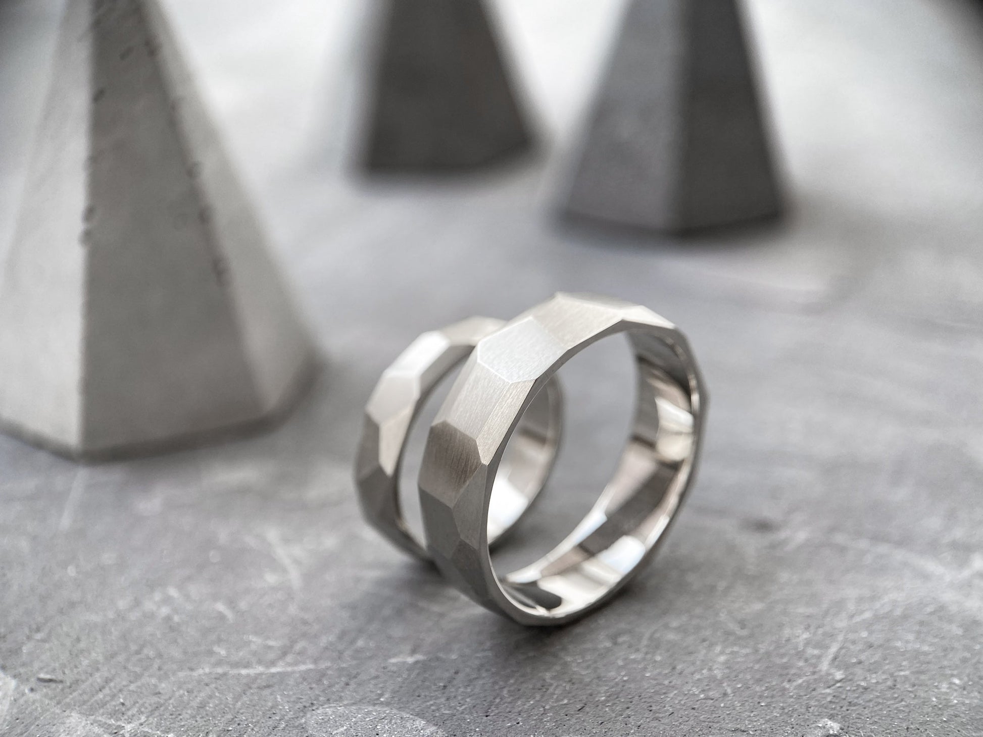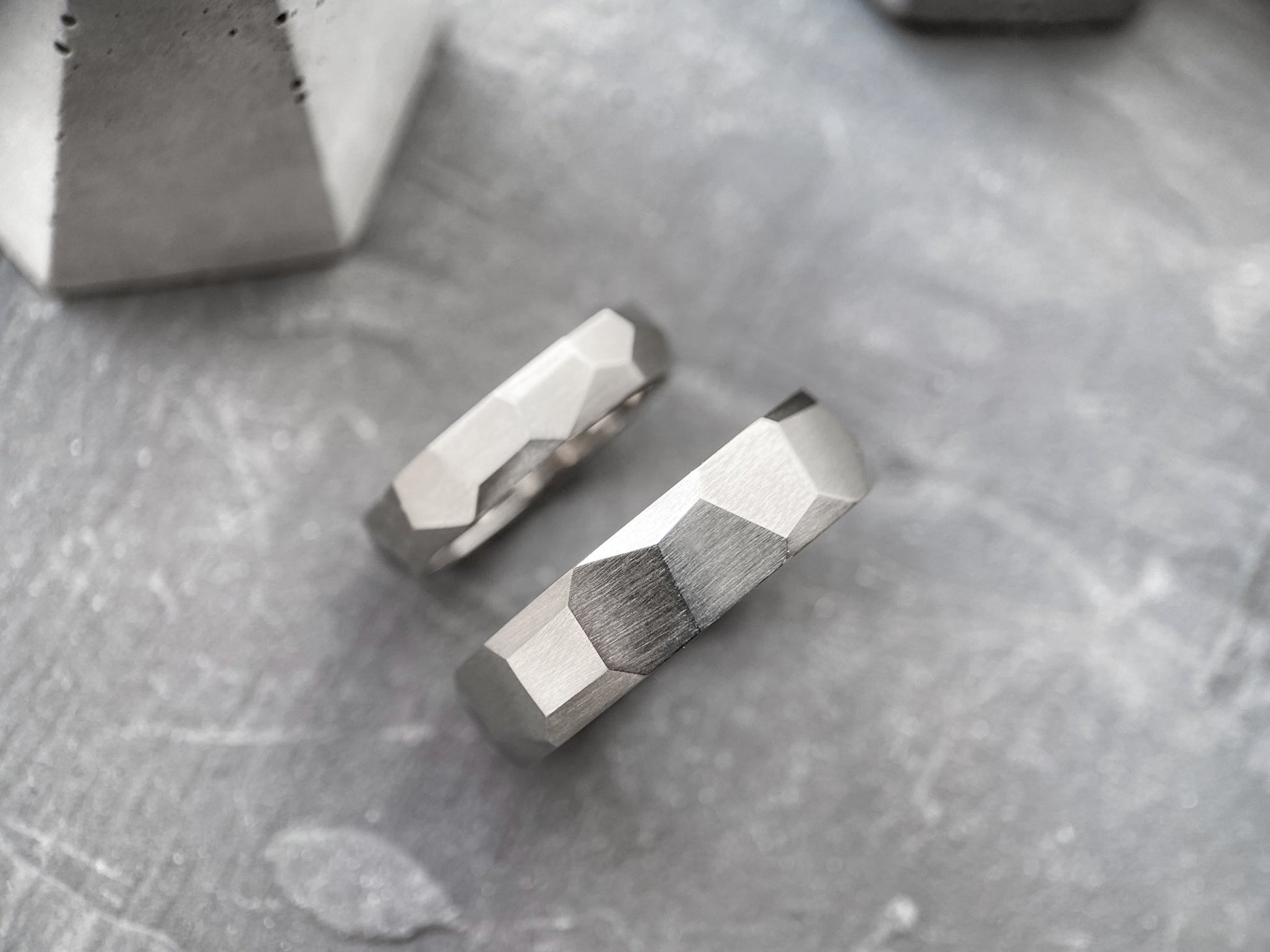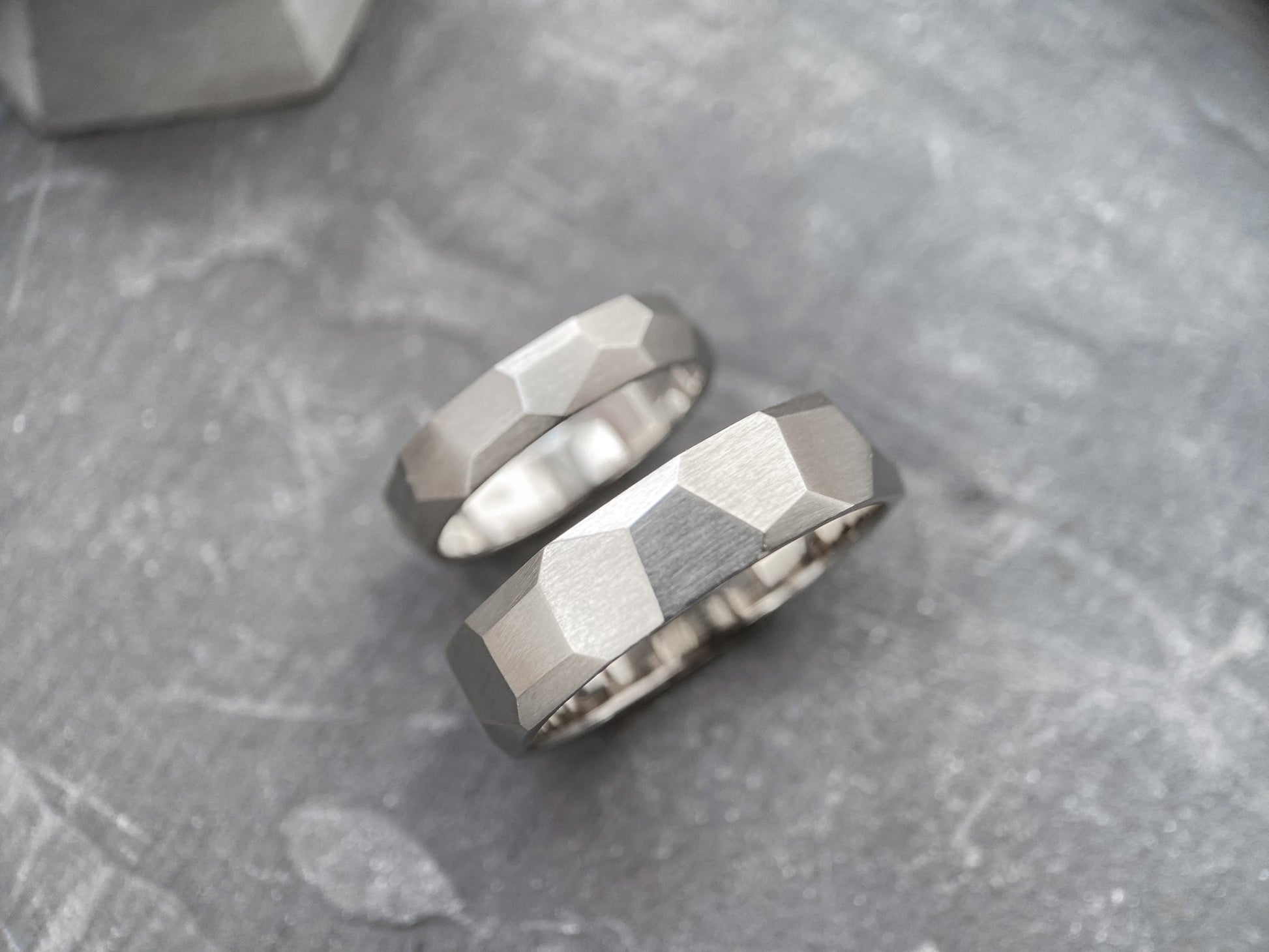 The "Large Facets" matte wedding bands embody refined elegance and modern minimalism. Their geometric design with sharp facets symbolizes resilience, determination, and the multifaceted nature of emotions.