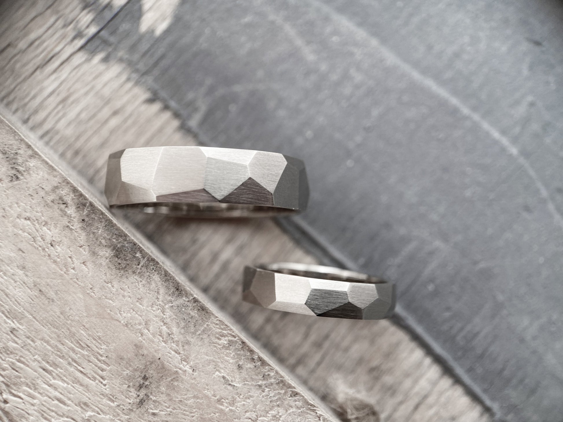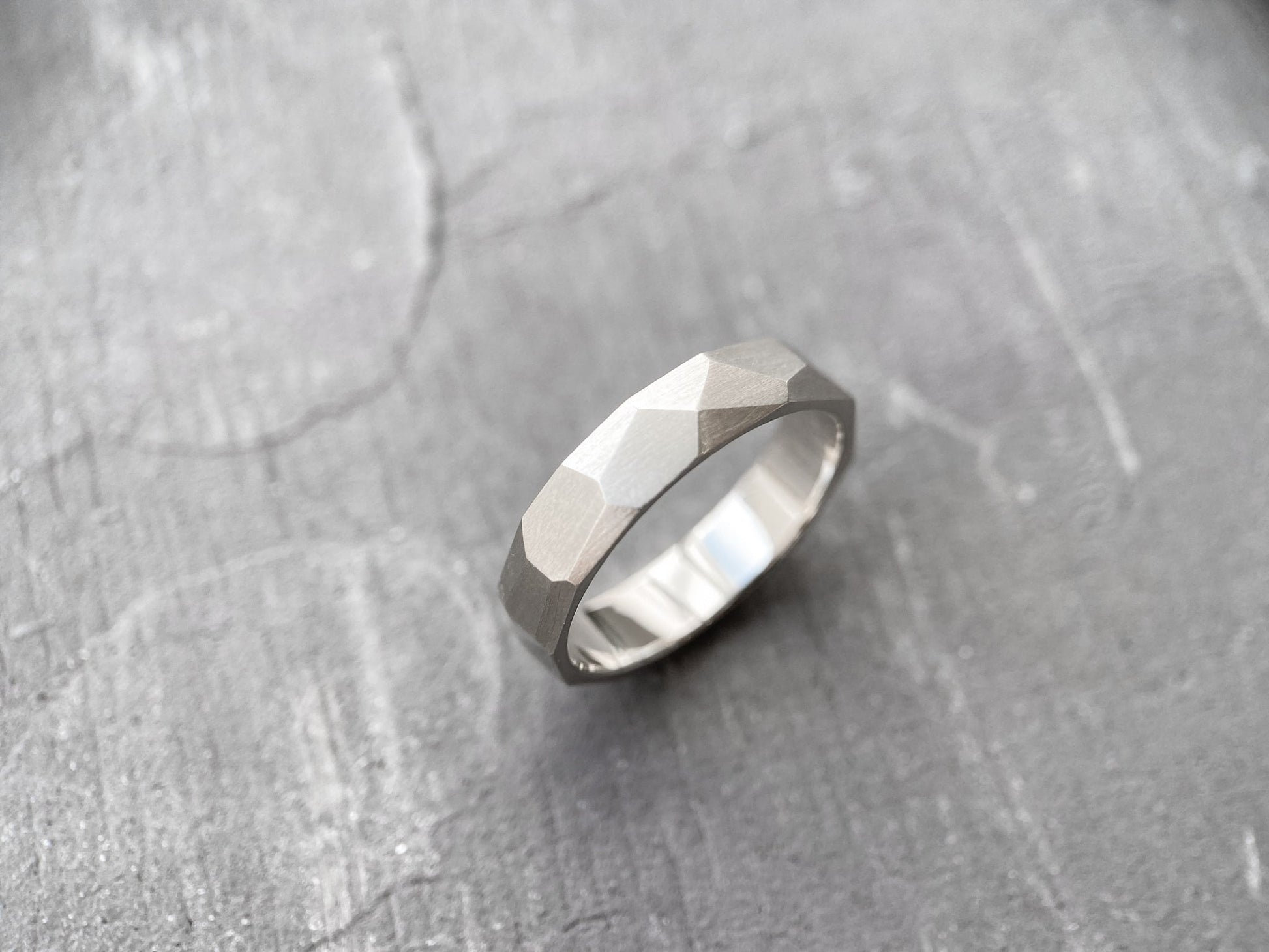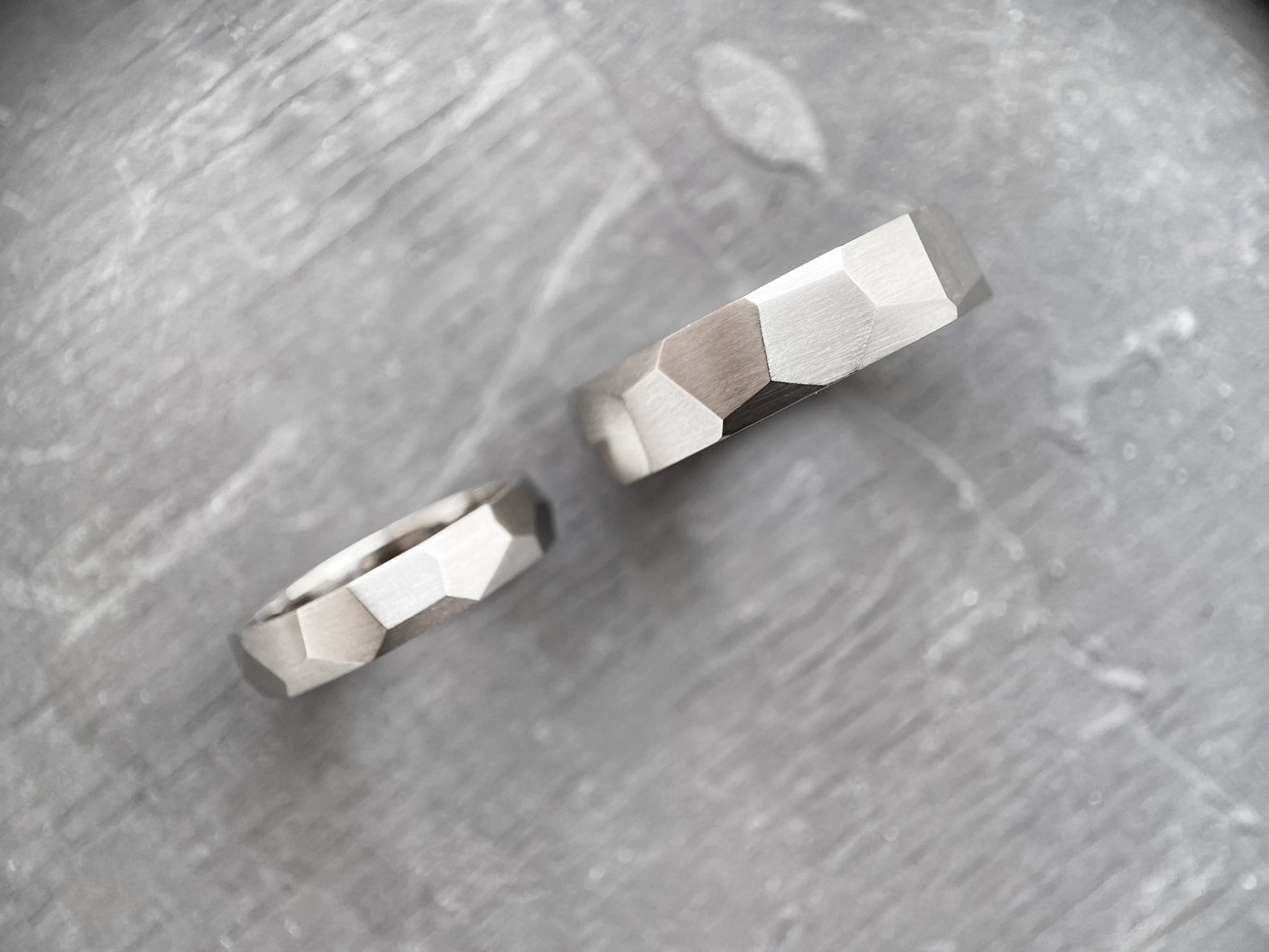 The "Large Facets" matte wedding bands embody refined elegance and modern minimalism. Their geometric design with sharp facets symbolizes resilience, determination, and the multifaceted nature of emotions.