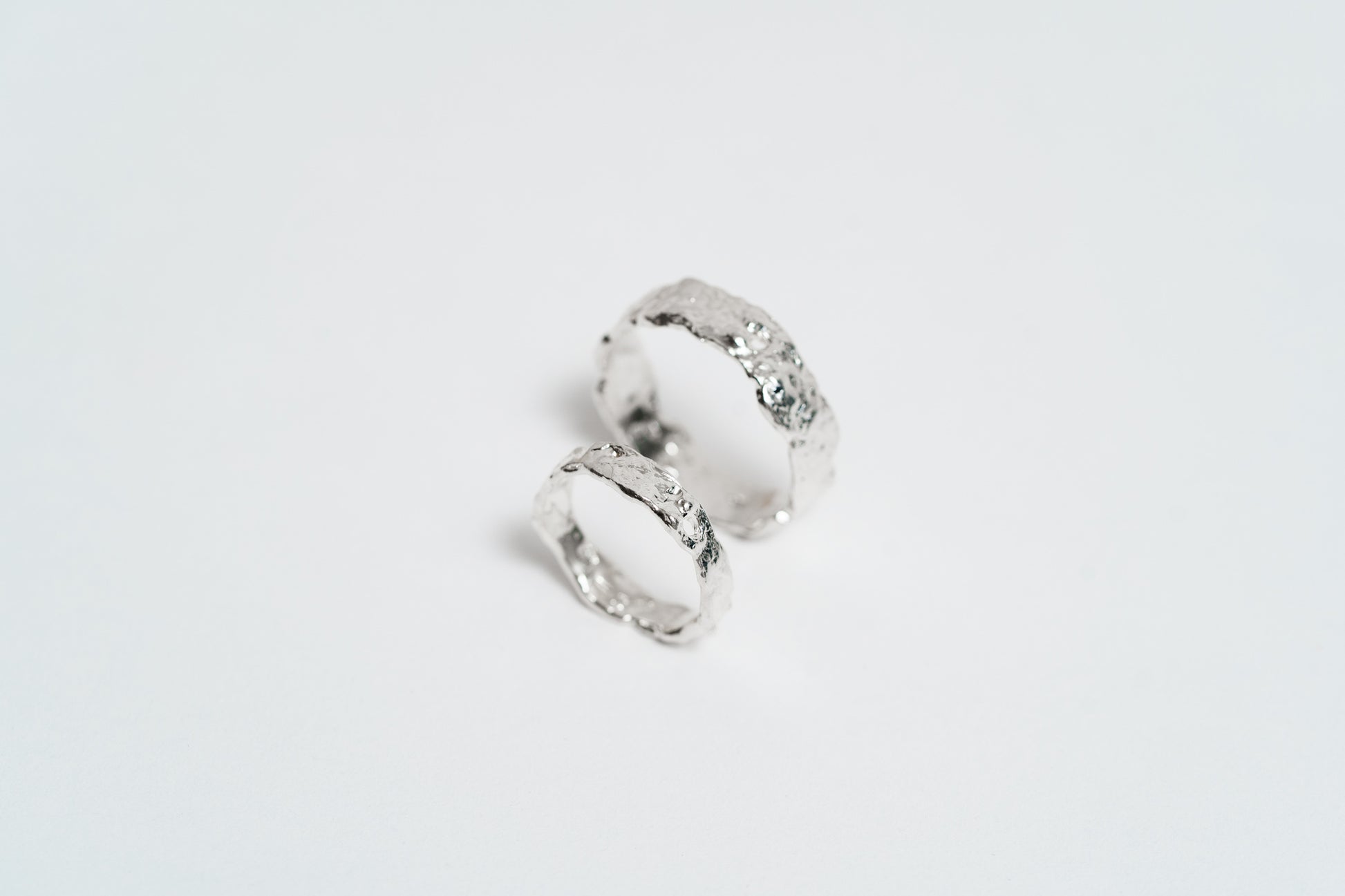 The "Light Asteroid" 3 and 6 mm wedding band pair symbolizes the harmony of two opposites. Each 3 mm ring features a texture reminiscent of an asteroid's surface, while the contrast between light and dark shades perfectly reflects unity and diversity in a relationship.