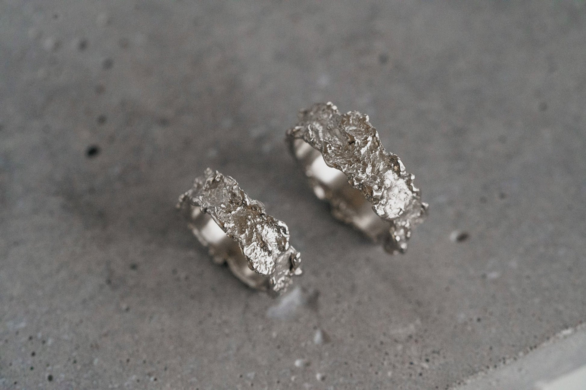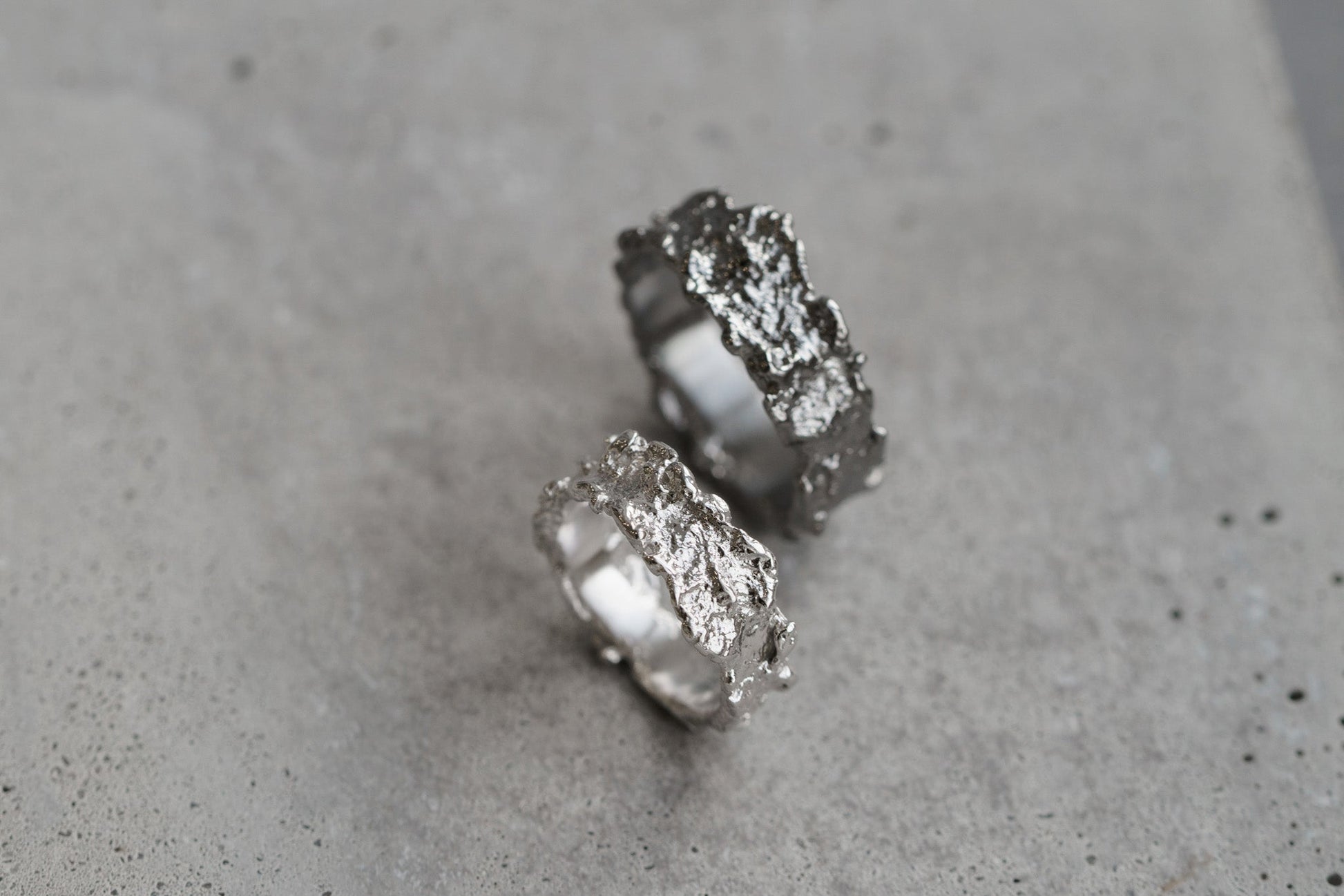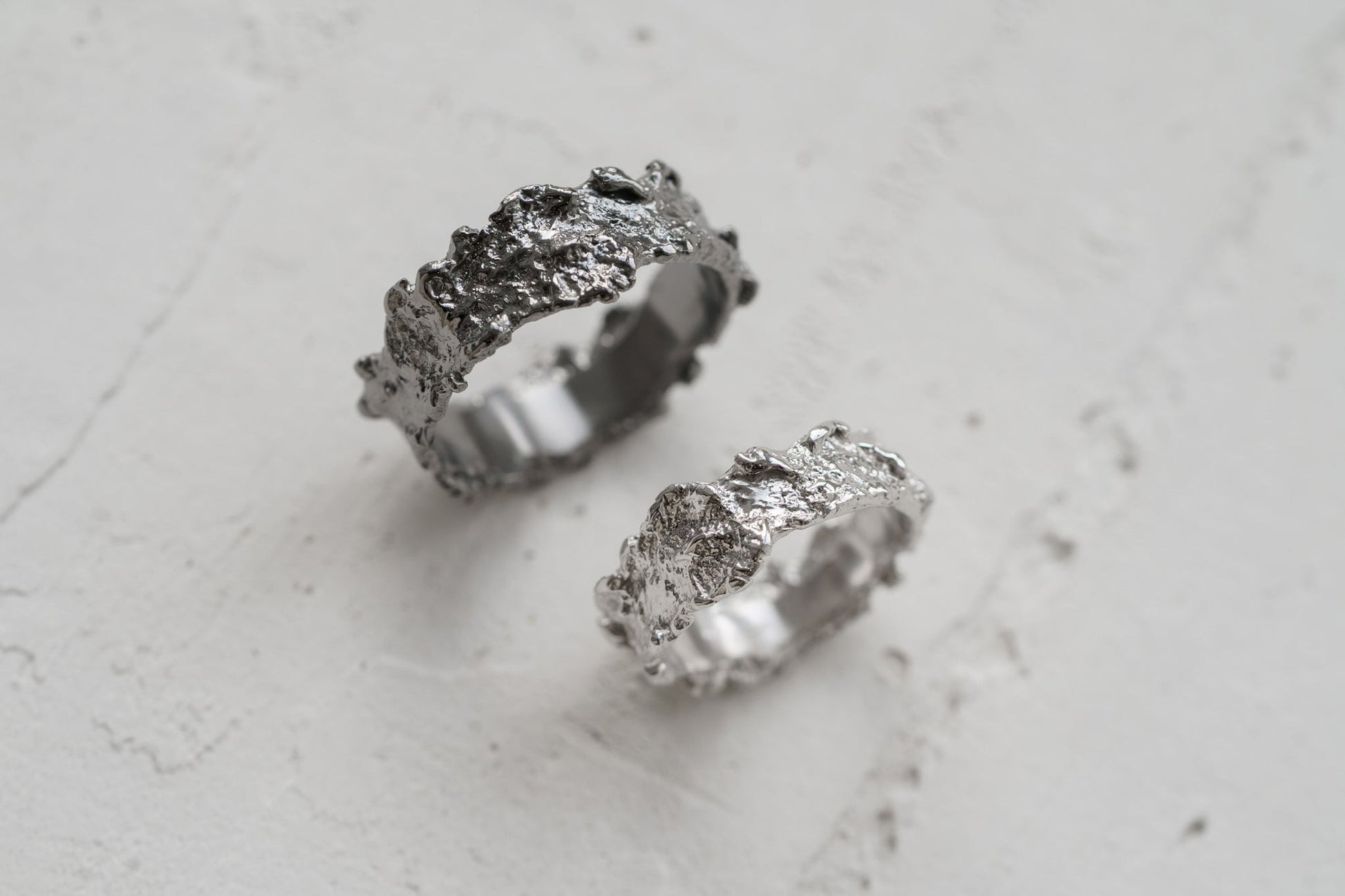 The light ring captivates with its texture, reminiscent of the uneven surface of coral reefs. Its design highlights resilience and depth. Meanwhile, the blackened ring reflects the untamed energy of nature, conveyed through a chaotic yet refined surface finish.