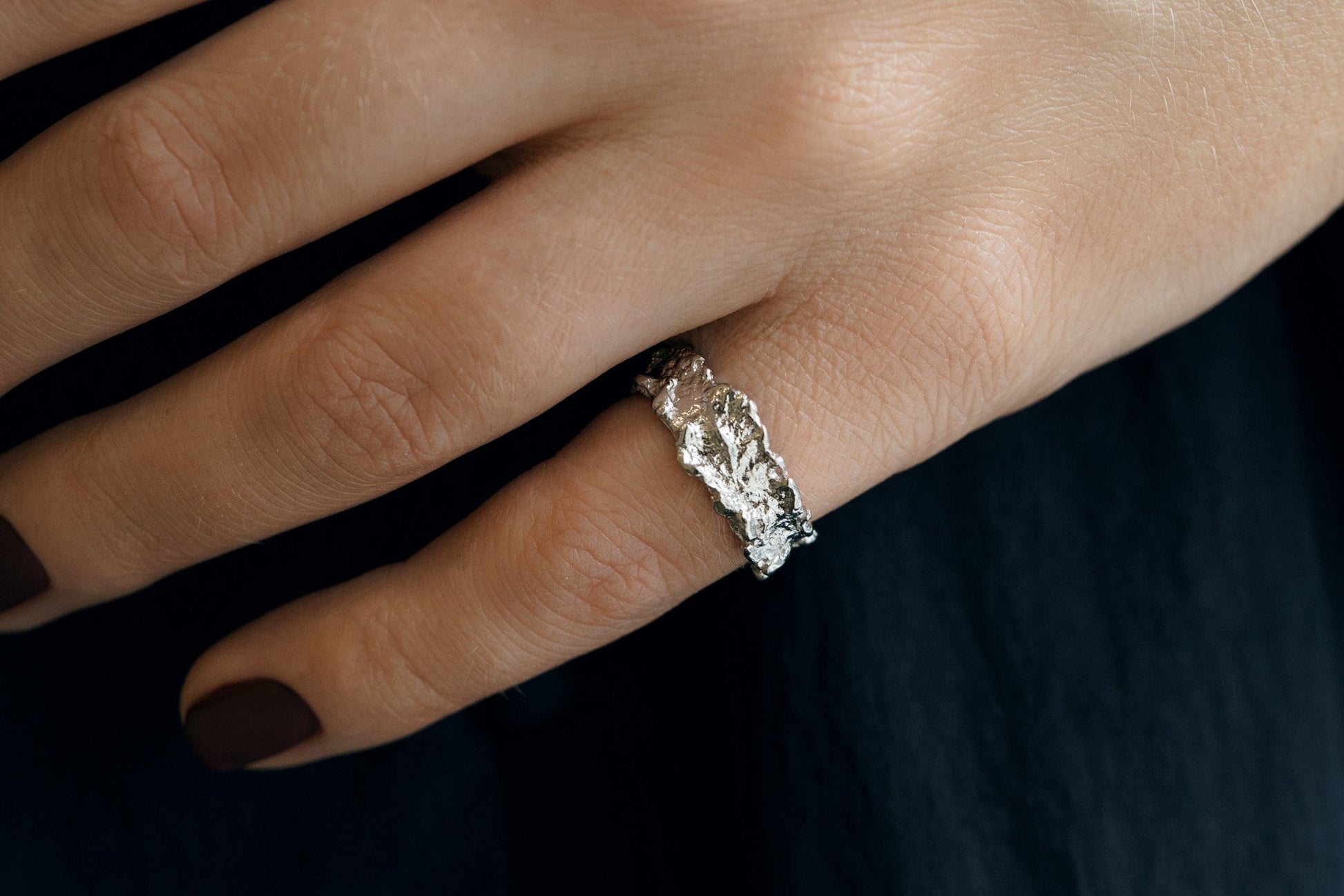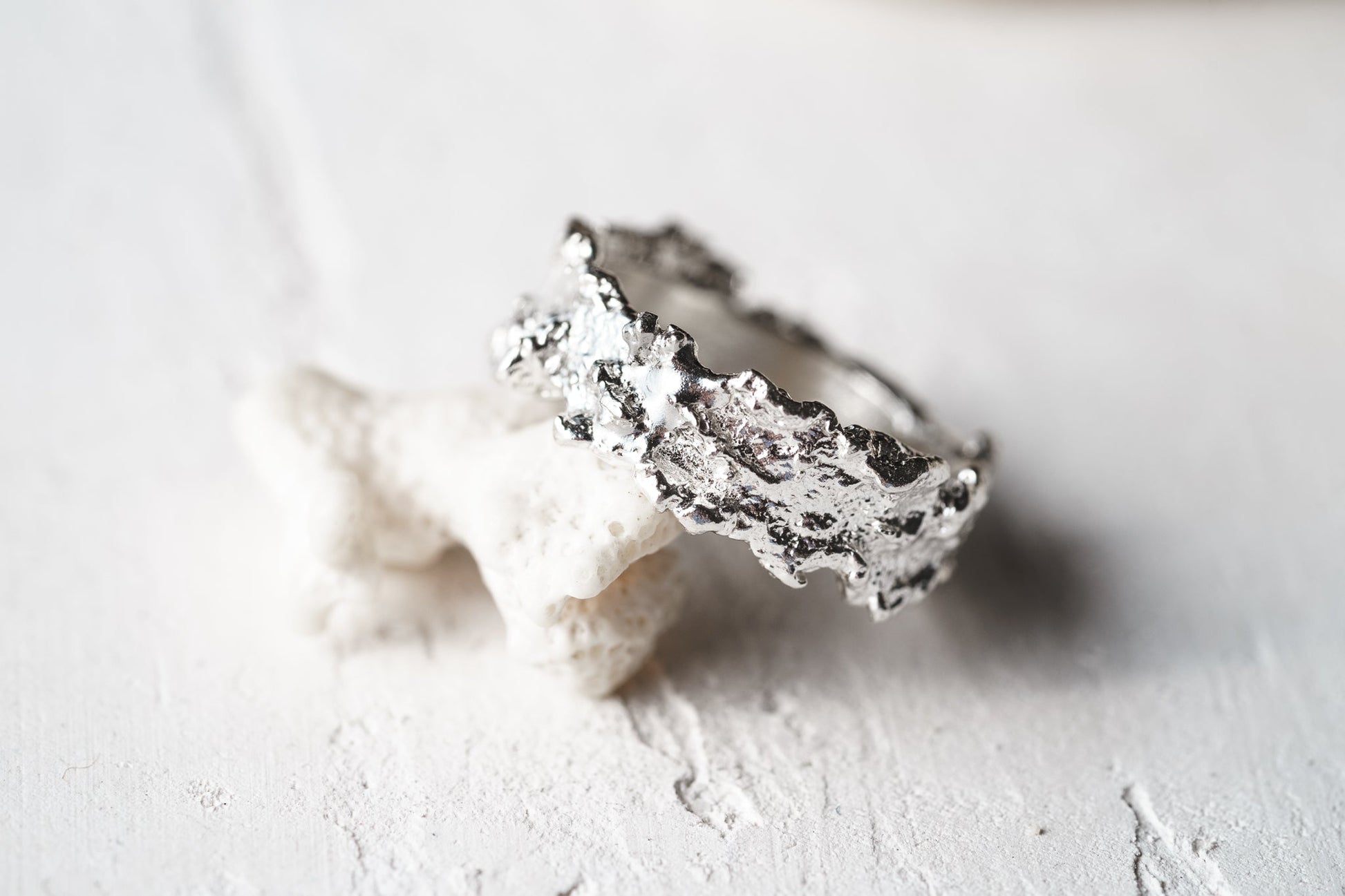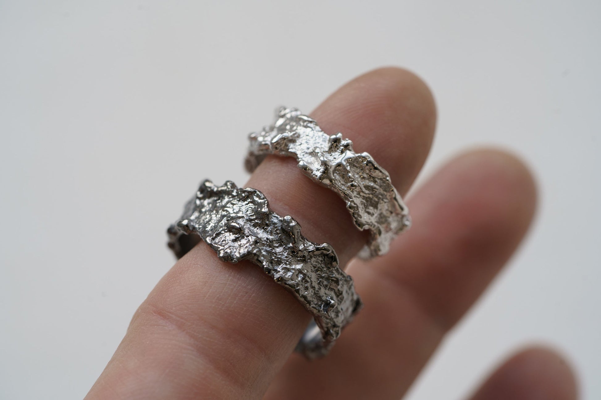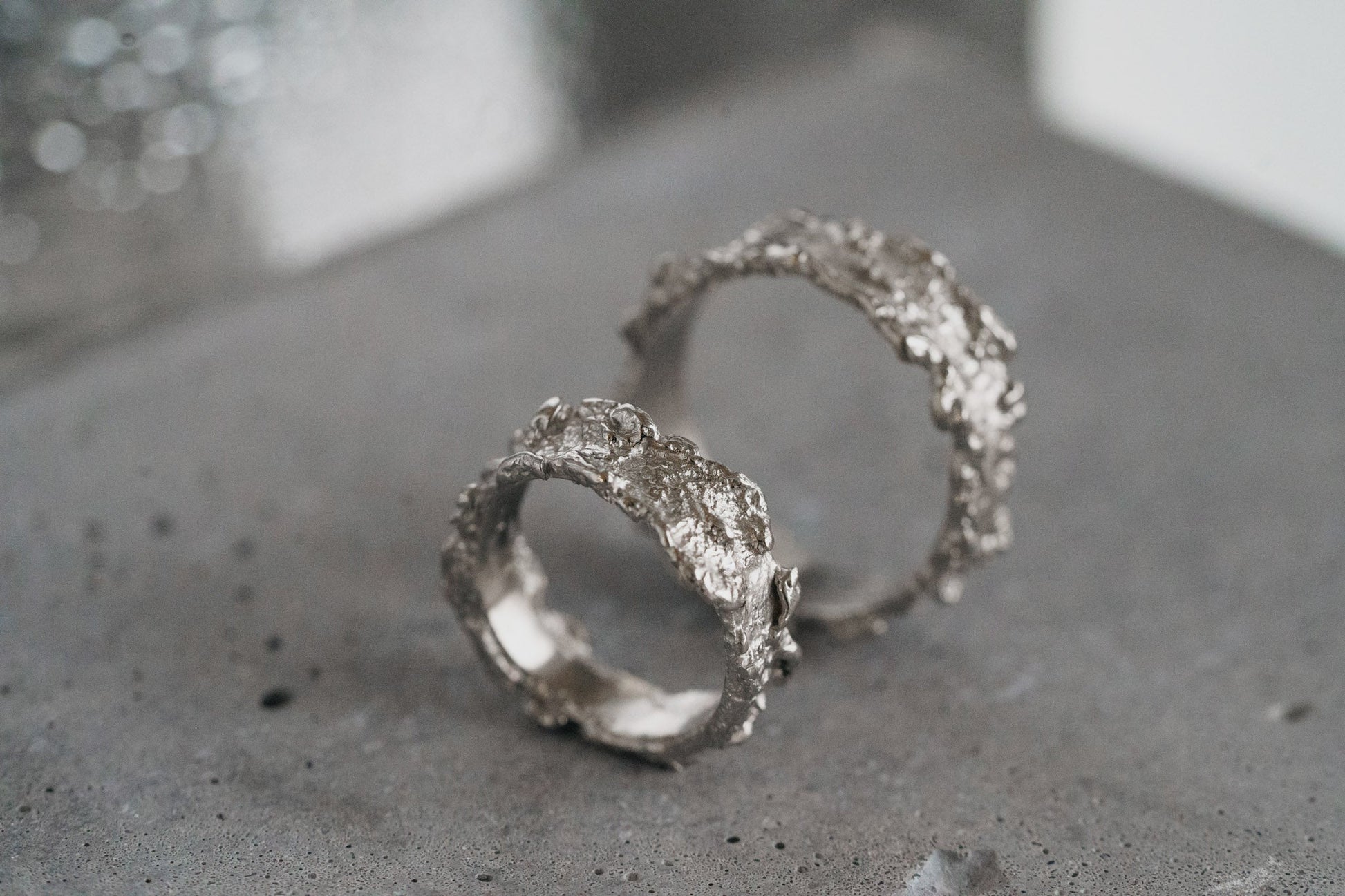 The light ring captivates with its texture, reminiscent of the uneven surface of coral reefs. Its design highlights resilience and depth. Meanwhile, the blackened ring reflects the untamed energy of nature, conveyed through a chaotic yet refined surface finish.