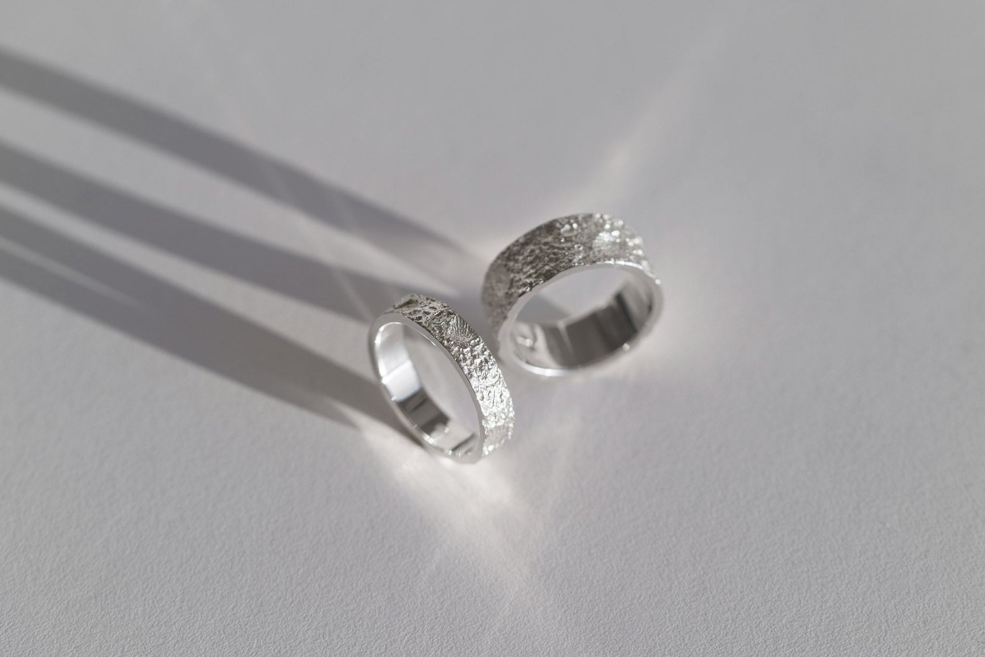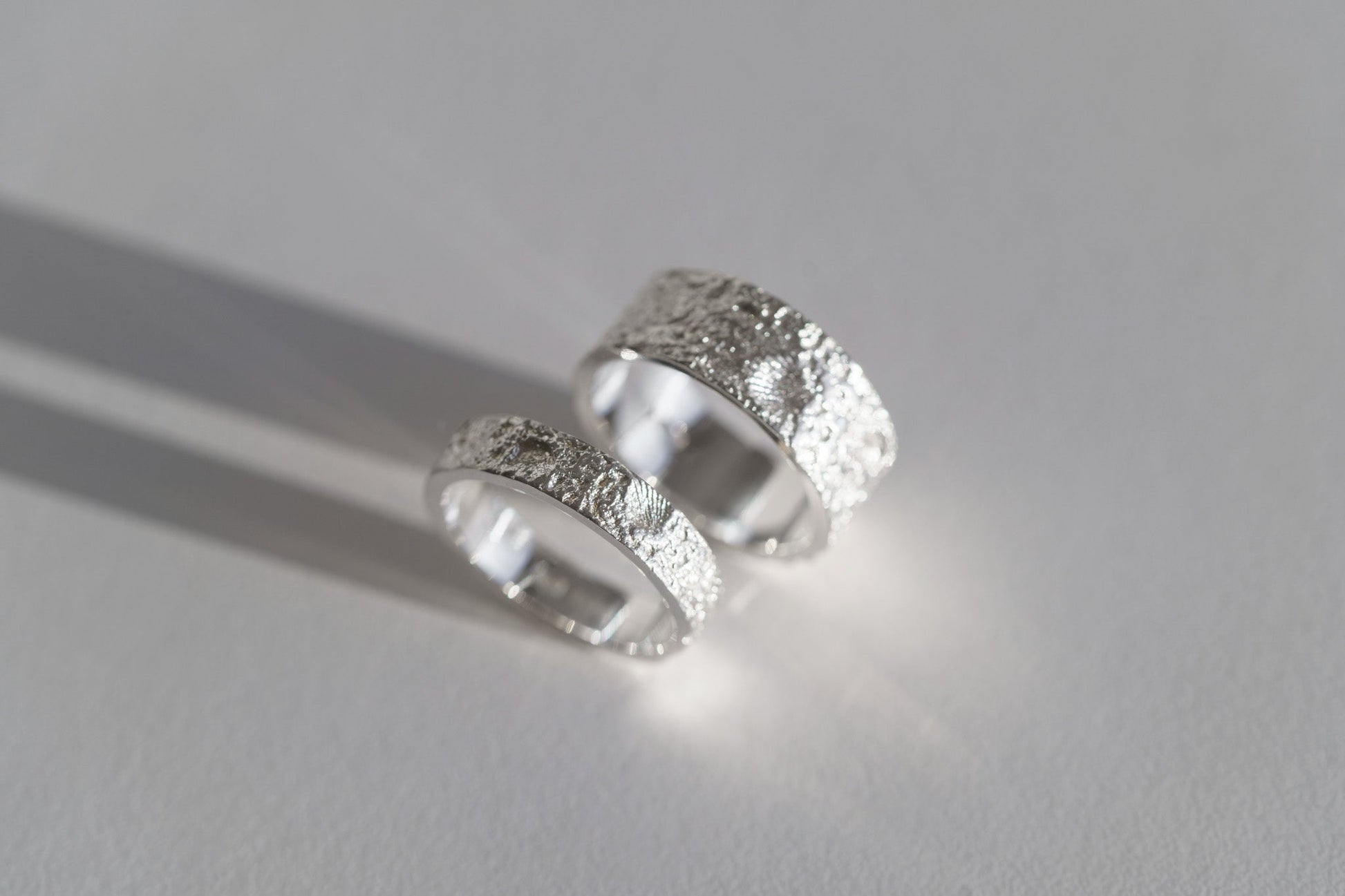 The light tones of the metal blend beautifully with the delicate texture, adding a touch of softness and modern elegance. The rings come in two widths—5 mm for a minimalist touch and 8 mm for a bolder statement, allowing each partner to express their individuality.