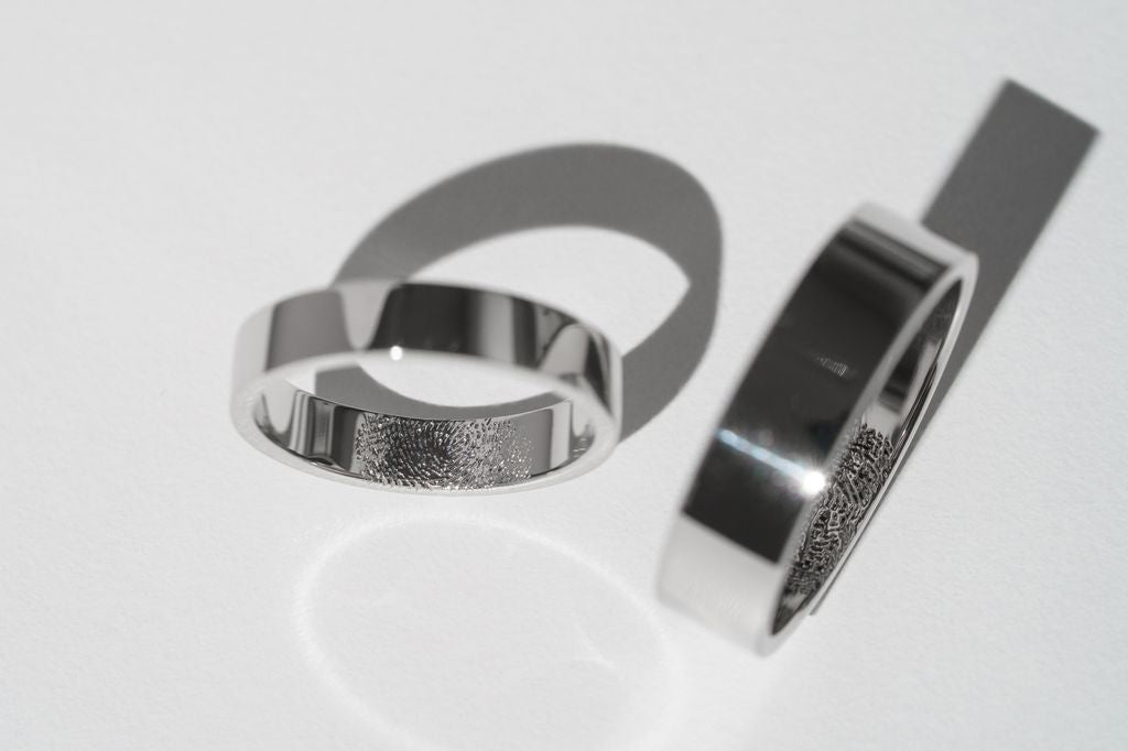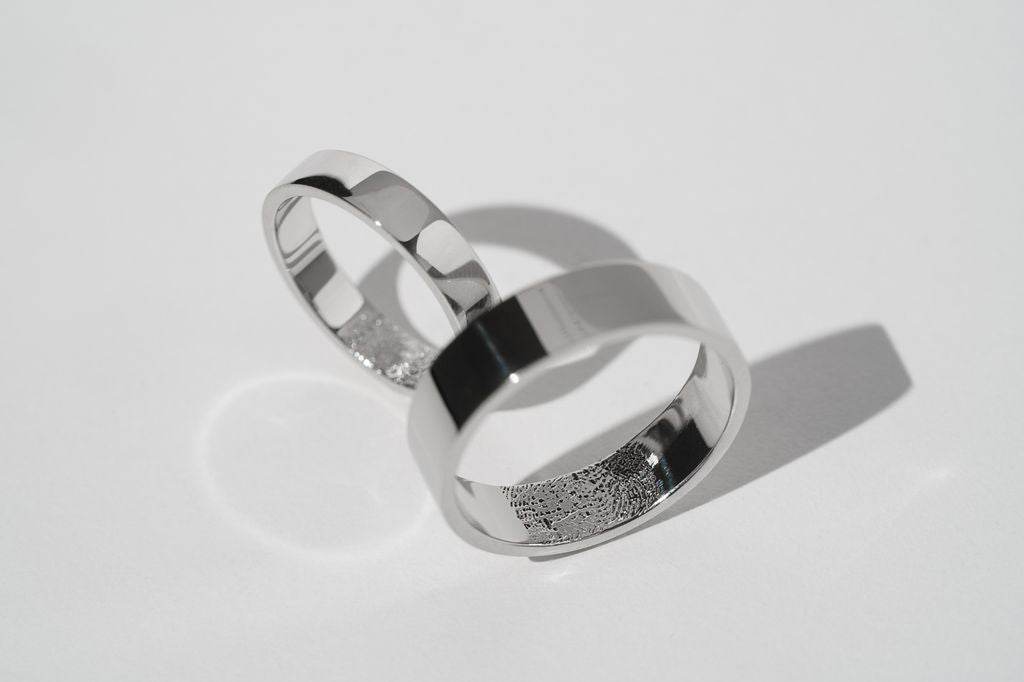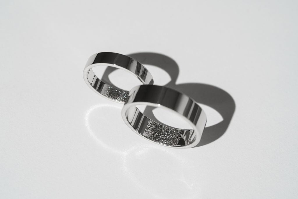 The elegant “Simple” wedding ring, 4 mm wide, is an ideal choice for those who appreciate stylish minimalism and uniqueness. Its refined smooth surface highlights the purity of the design, while a personalized fingerprint adds symbolic meaning and personal value.