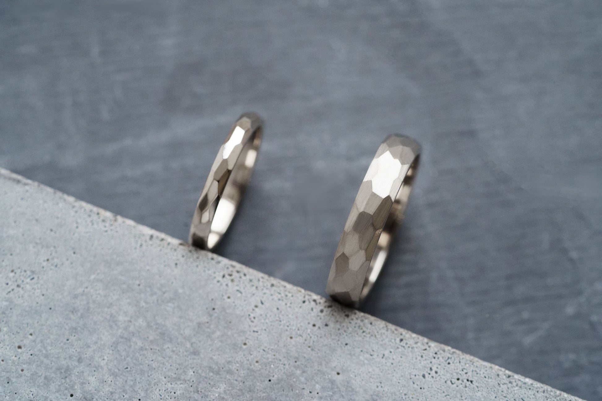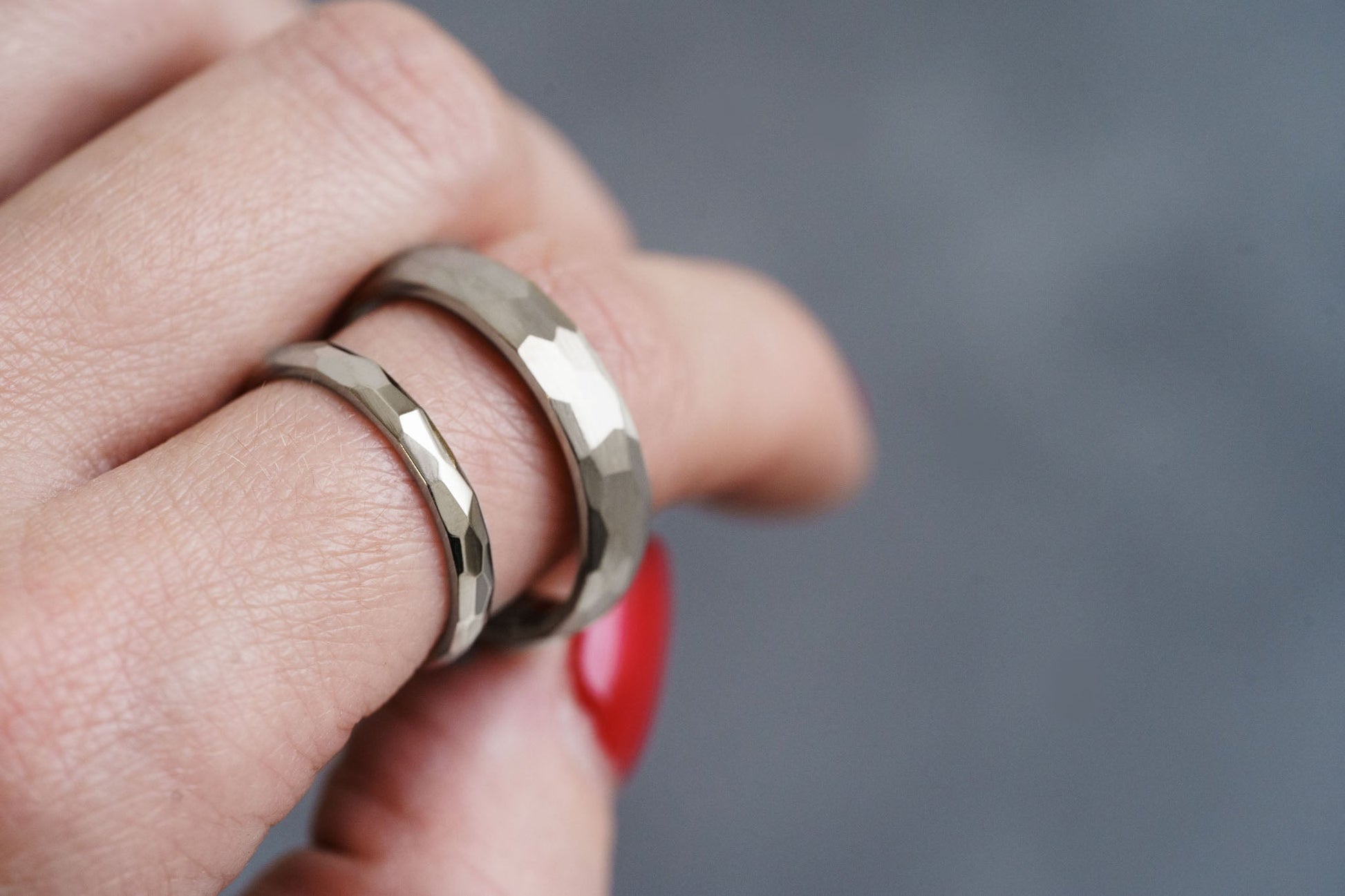 The "Small Facets" wedding bands embody minimalism and elegance. Their refined design captivates with intricate detailing: the surface is adorned with numerous delicate facets that catch the light, creating a shimmering effect.