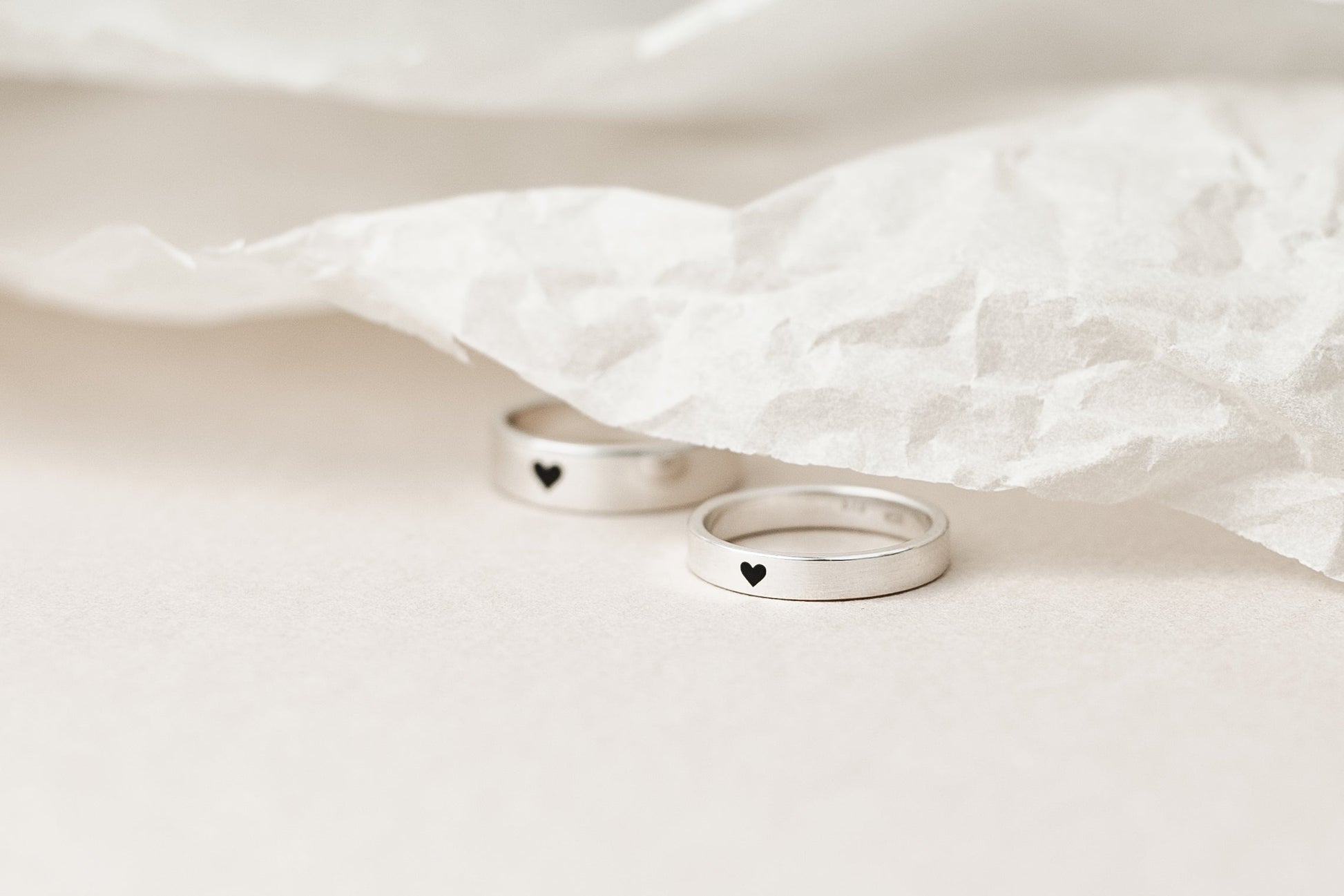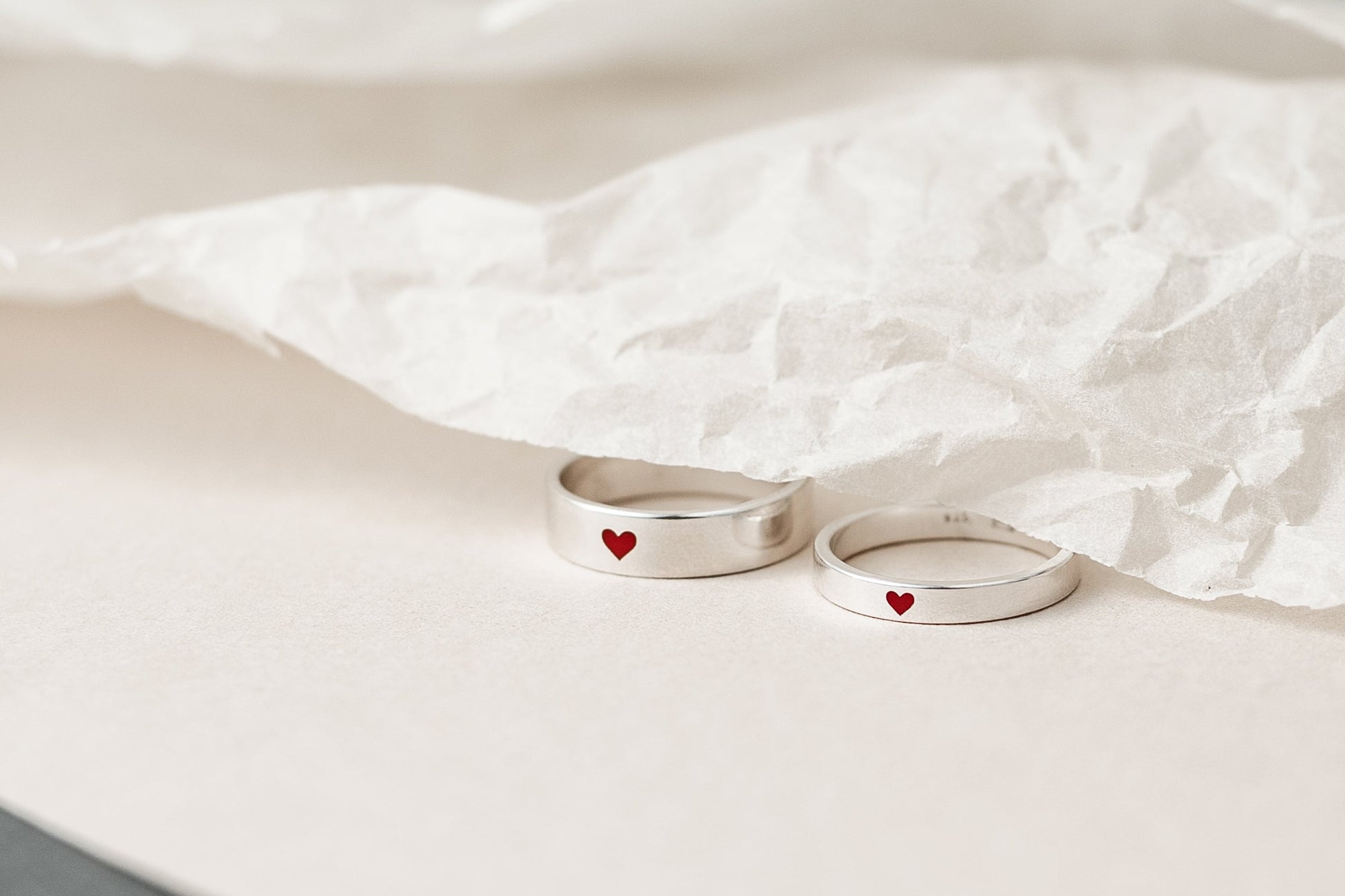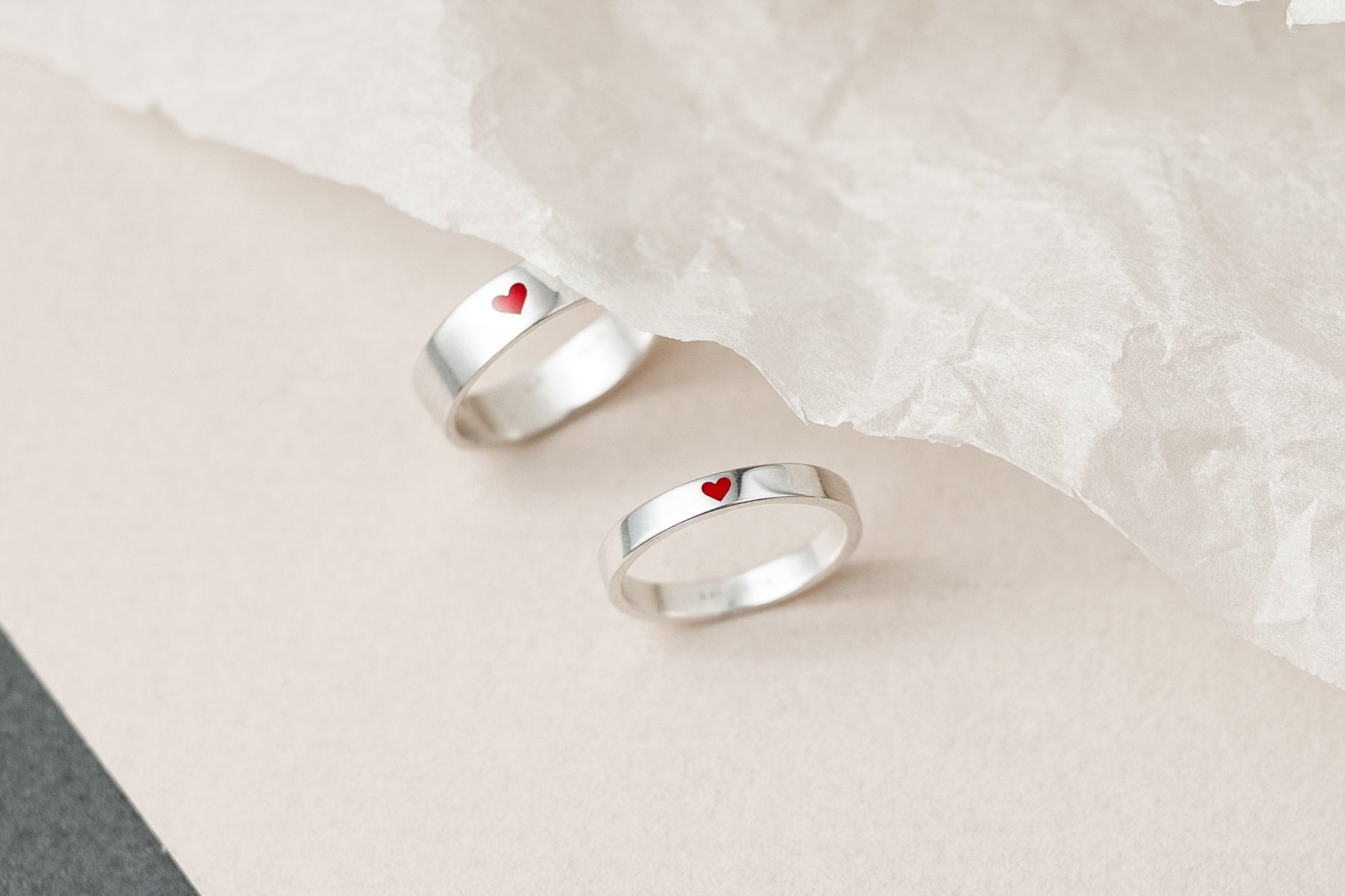 The "With Love" wedding band pair (3 mm & 5 mm) with a red or black heart is a delicate embodiment of love and harmony. The combination of 3 mm and 5 mm widths creates the perfect balance between elegance and boldness, while the heart—available in red or black—adds a special meaning.