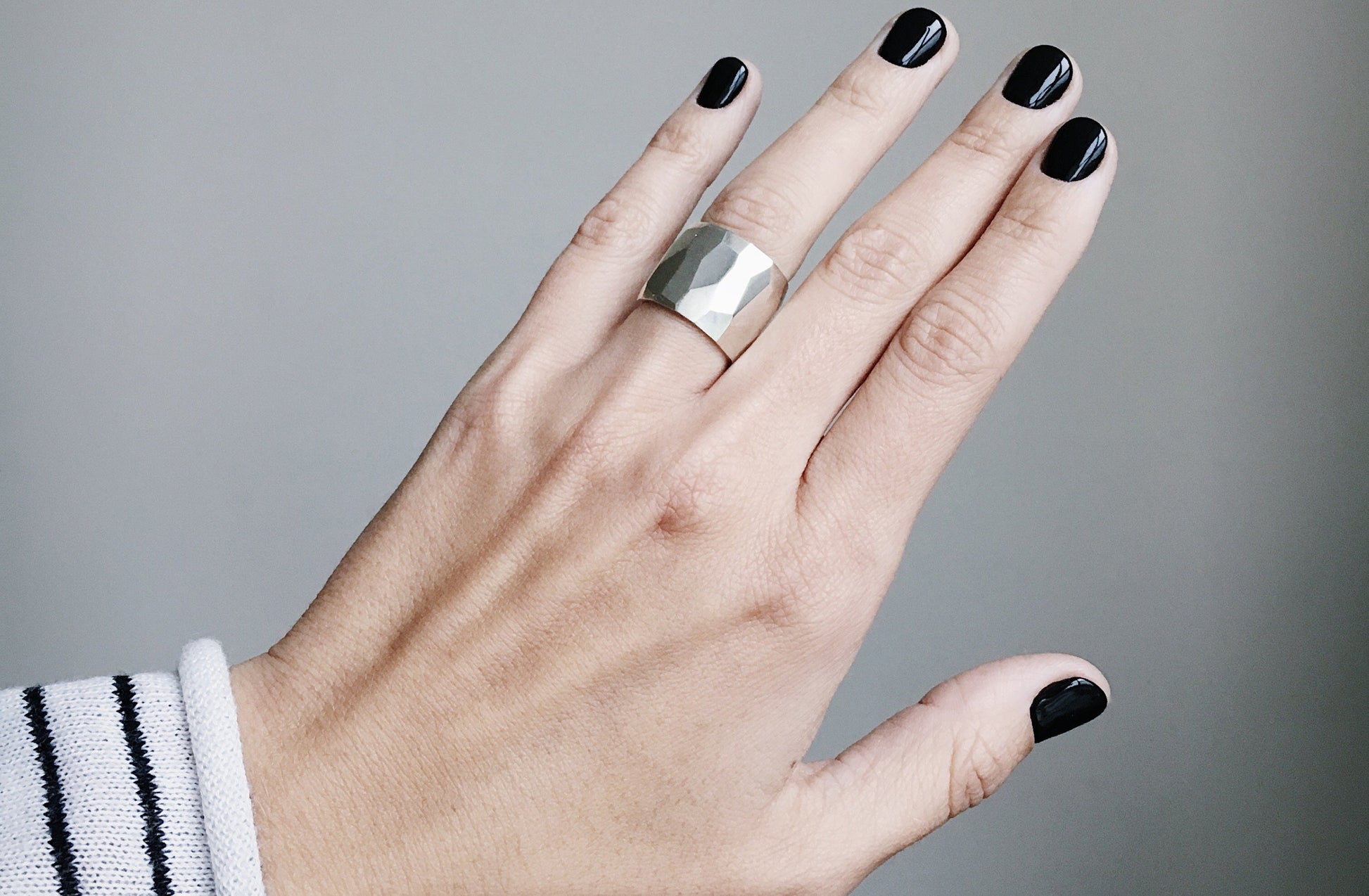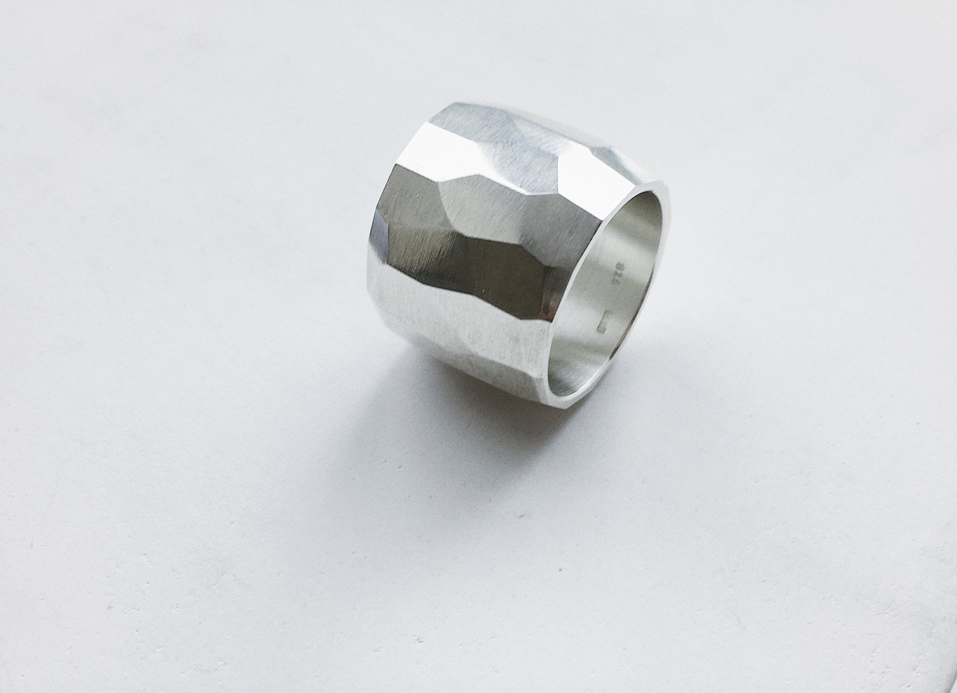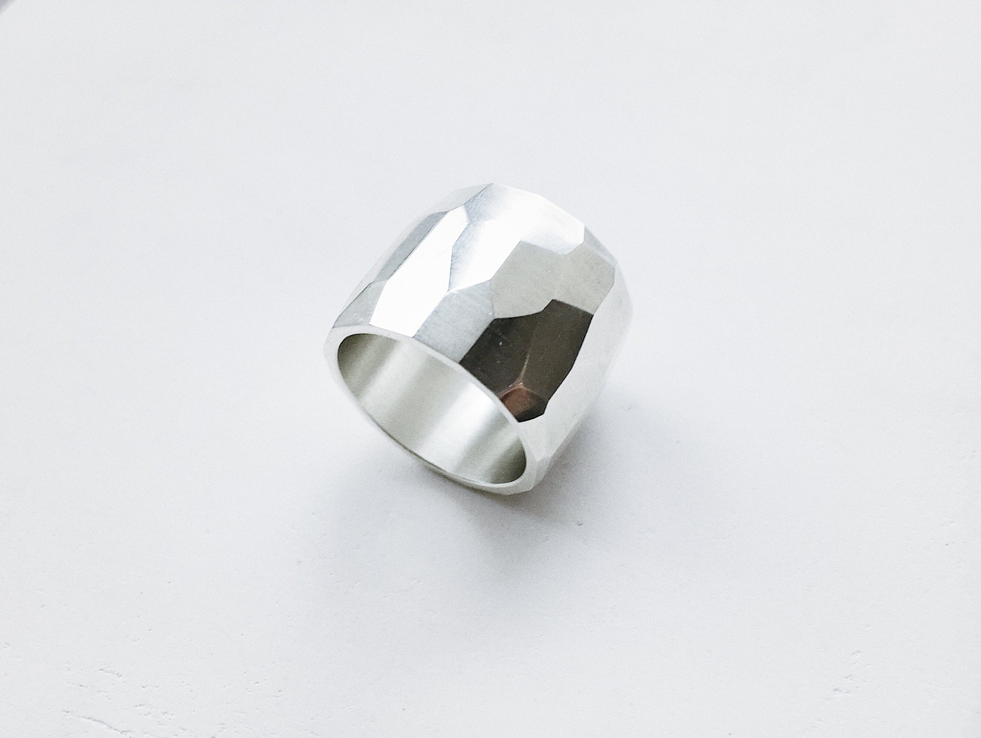 This 15mm wide ring, "Facets", boasts of an attractive design and incomparable style. The unique facets are a striking accent to any outfit, making a bold statement with its size and visual appeal. Upgrade any look with this expertly crafted piece.